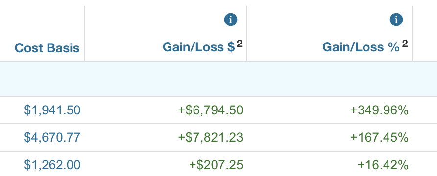 >>532409261>claiming a 1 day +22,000% gain in a day is insane.How retarded are you? I claimed a 22,310% gain across a period of, now, 11 years since I stopped buying. Last summer it peaked at a roughly 40,000% gain (from my average cost basis), BTW.