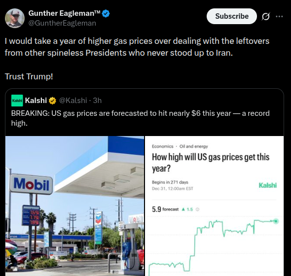 >>532409581>we have limited gas reserves because oil companies left>we started shit with a middle eastern nation>they blew up a ton of oil and gas infrastructure that the world relies on out of spite>now gas is $4 a gallon and is getting more expensive>try to make other countries pay more for our gas (4D chess move right here)>they opt for russian gas insteadGod damn, we're winning so fucking much, aren't we?