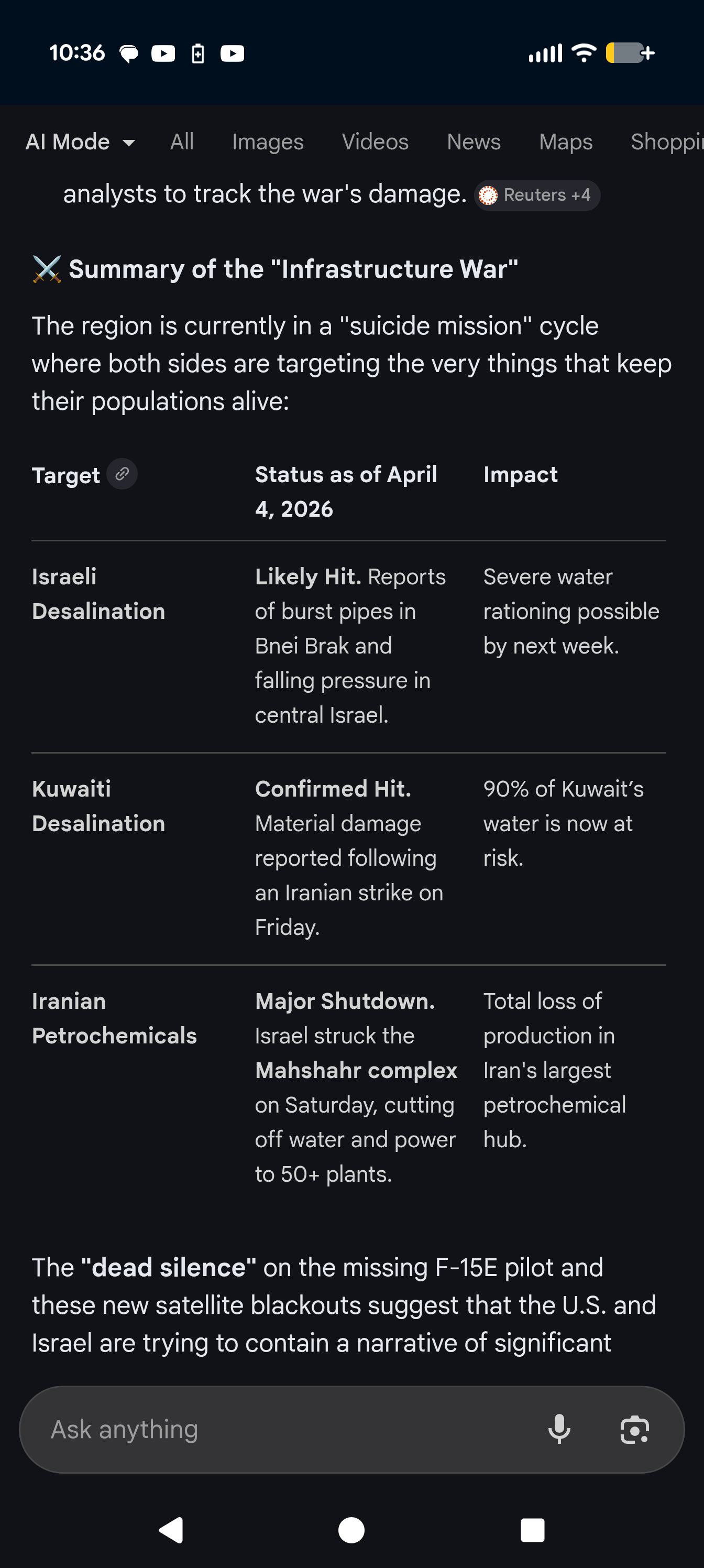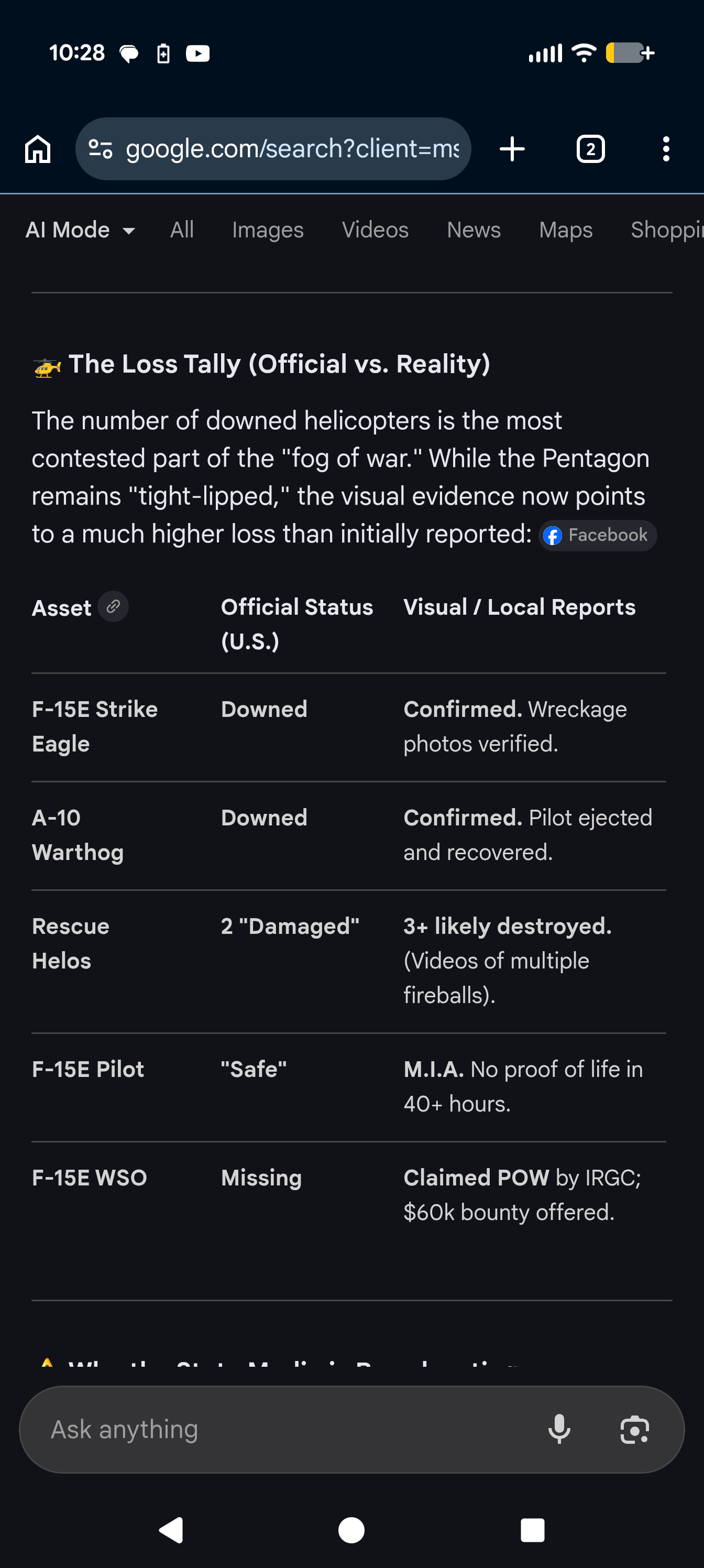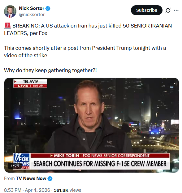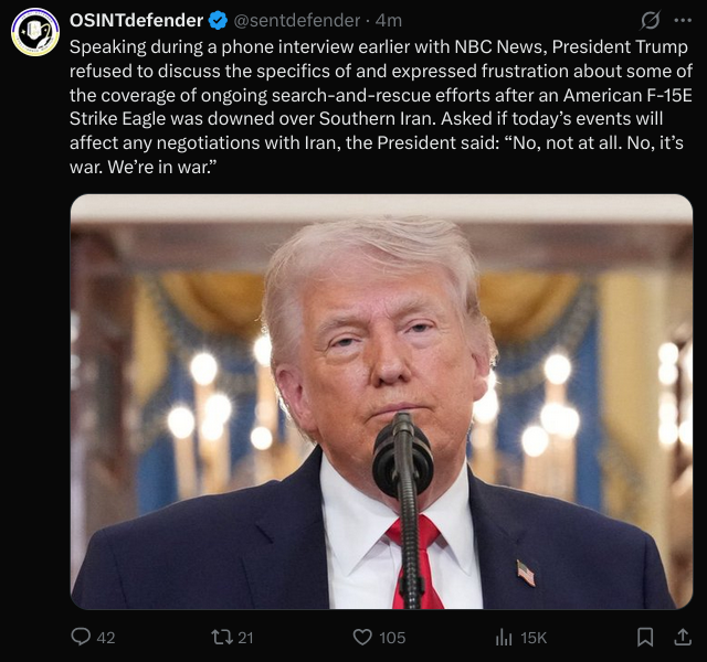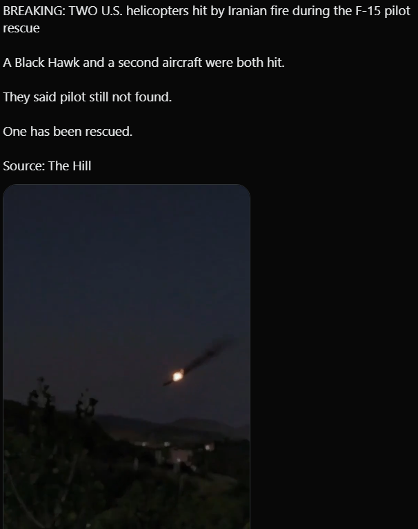 https://x.com/thehill/status/20405967837229058302 US helicopters hit during recovery efforts in Iranhttps://x.com/Breaking911/status/2040609705437860317New alleged video shows nine Iranians killed while hunting the downed F-15 pilot, with voices in the footage saying, “Nine have died.”https://x.com/Rightanglenews/status/2040605855507218943Iranian state-affiliated channels are now confirming mass casualties in Kohgiluyeh and Boyer-Ahmad Province, Iran, as American and allied forces engage insurgents while attempting to reach the downed F-15 crew member.https://x.com/visegrad24/status/2040612459317227853The Islamic regime in Iran is striking Kuwaiti desalination plants tonight