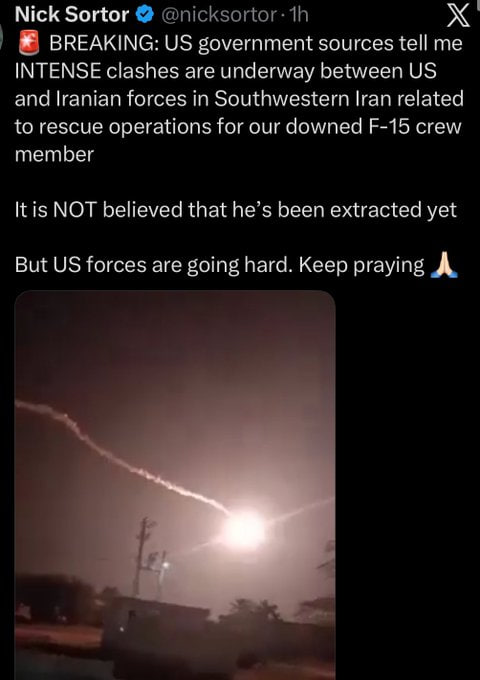 Previous: >>532407973HAPPY #700 /pig/▶Pilot Easter egg hunt:>In the last hour, the IRGC's 'Saberin' Unit and the "65th (NOHED)" Airborne Special Forces engaged with US Pararescuemen and Special Tactic forces in the area.>Early reports indicate that several IRGC members lay in ambush for several hours, using the pilot as bait to lure in SAR aircraft>Locals, Iran’s National Police Command (FARAJA), the IRGC, and Basij forces are reportedly firing at U.S. helicopters that have entered Chaharmahal and Bakhtiari Province in search of the second pilot of the downed F-15E.▶Day 36>An Iranian drone struck the Kuwait Petroleum Corporation building, which also houses the Ministry of Petroleum> US Air Force Pararescue Jumpers (PJs) are currently mounting an operation to rescue the last remaining F-15 pilot inside Iranian territory. HH-60 Pave Hawks are currently airborne in Chaharmahal and Bakhtiari provinces.>Second American A-10 shot down over Kuwait>Do not trust any "happenings" without link/proof▶!!!THREAD THEMES!!! !!!LISTEN TO THESE BEFORE POSTING!!!https://www.youtube.com/watch?v=RgdxKgxJyuwhttps://www.youtube.com/watch?v=eU-YAJF2dp8https://www.youtube.com/watch?v=KfCsDlHlVo4 ▶Oil:>https://oilprice.com/oil-price-charts/>Dubai Crude $128>WTI $111>Brent Crude $109▶Kinohttps://files.catbox.moe/20lpu8.mp4https://files.catbox.moe/jv7tdp.mp4▶Live-streams:https://www.youtube.com/watch?v=4E-iFtUM2kk https://www.youtube.com/watch?v=TdcrT5OcS9c https://www.youtube.com/watch?v=53G-Oy4r6M4 ▶Telegram channelshttps://rentry.org/tgnews▶Israel Rocket Alertshttps://www.tzevaadom.co.il/en/▶Air Traffichttps://www.flightradar24.com/https://flightaware.com/livehttps://globe.adsbexchange.com▶Maritime Traffichttps://www.marinetraffic.com/https://www.vesselfinder.com/▶Bread:https://rentry.org/PIGOP