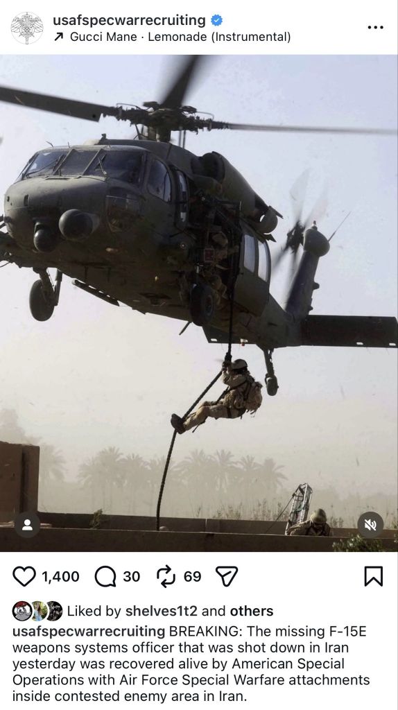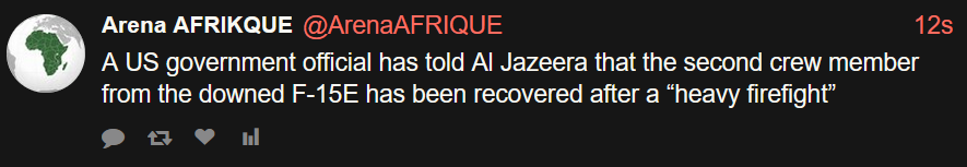 Missing US airman recovered, but rescue operation ongoingWe have more on the US operation inside Iran.A US government official has told Al Jazeera that the rescue operation is still in progress.The missing crew member is confirmed rescued, they said. but not safe yet. The rescue team must still successfully exfiltrate from Iran and get back to safety, they added.LOOOOOOOL