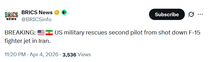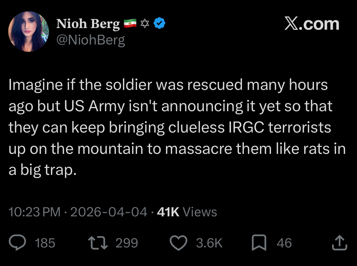 Previous: >>532410126HAPPY #701 /pig/▶Pilot Easter egg hunt:>In the last hour, the IRGC's 'Saberin' Unit and the "65th (NOHED)" Airborne Special Forces engaged with US Pararescuemen and Special Tactic forces in the area.>Early reports indicate that several IRGC members lay in ambush for several hours, using the pilot as bait to lure in SAR aircraft>Locals, Iran’s National Police Command (FARAJA), the IRGC, and Basij forces are reportedly firing at U.S. helicopters that have entered Chaharmahal and Bakhtiari Province in search of the second pilot of the downed F-15E.▶Day 36>An Iranian drone struck the Kuwait Petroleum Corporation building, which also houses the Ministry of Petroleum> US Air Force Pararescue Jumpers (PJs) are currently mounting an operation to rescue the last remaining F-15 pilot inside Iranian territory. HH-60 Pave Hawks are currently airborne in Chaharmahal and Bakhtiari provinces.>Second American A-10 shot down over Kuwait>Do not trust any "happenings" without link/proof▶!!!THREAD THEMES!!! !!!LISTEN TO THESE BEFORE POSTING!!!https://www.youtube.com/watch?v=RgdxKgxJyuwhttps://www.youtube.com/watch?v=eU-YAJF2dp8https://www.youtube.com/watch?v=KfCsDlHlVo4▶Oil:>https://oilprice.com/oil-price-charts/>Dubai Crude $128>WTI $111>Brent Crude $109▶Kinohttps://files.catbox.moe/20lpu8.mp4 (embed)https://files.catbox.moe/jv7tdp.mp4 (embed)▶Live-streams:https://www.youtube.com/watch?v=4E-iFtUM2kkhttps://www.youtube.com/watch?v=TdcrT5OcS9chttps://www.youtube.com/watch?v=53G-Oy4r6M4▶Telegram channelshttps://rentry.org/tgnews▶Israel Rocket Alertshttps://www.tzevaadom.co.il/en/▶Air Traffichttps://www.flightradar24.com/https://flightaware.com/livehttps://globe.adsbexchange.com▶Maritime Traffichttps://www.marinetraffic.com/https://www.vesselfinder.com/▶Bread:https://rentry.org/PIGOP