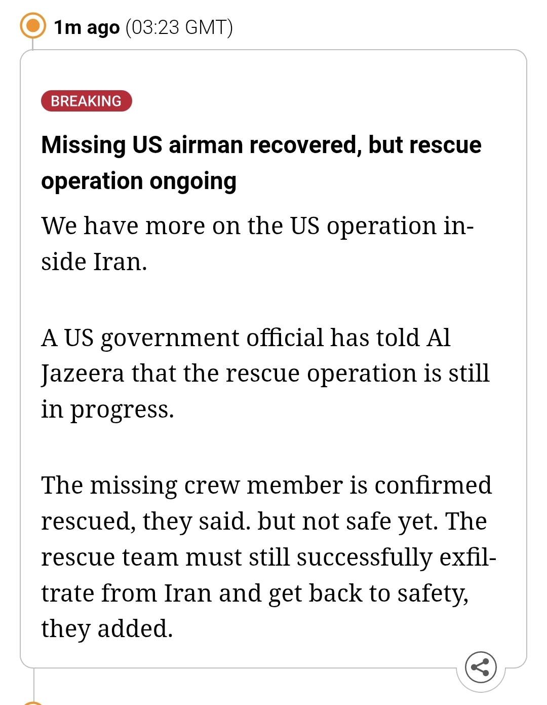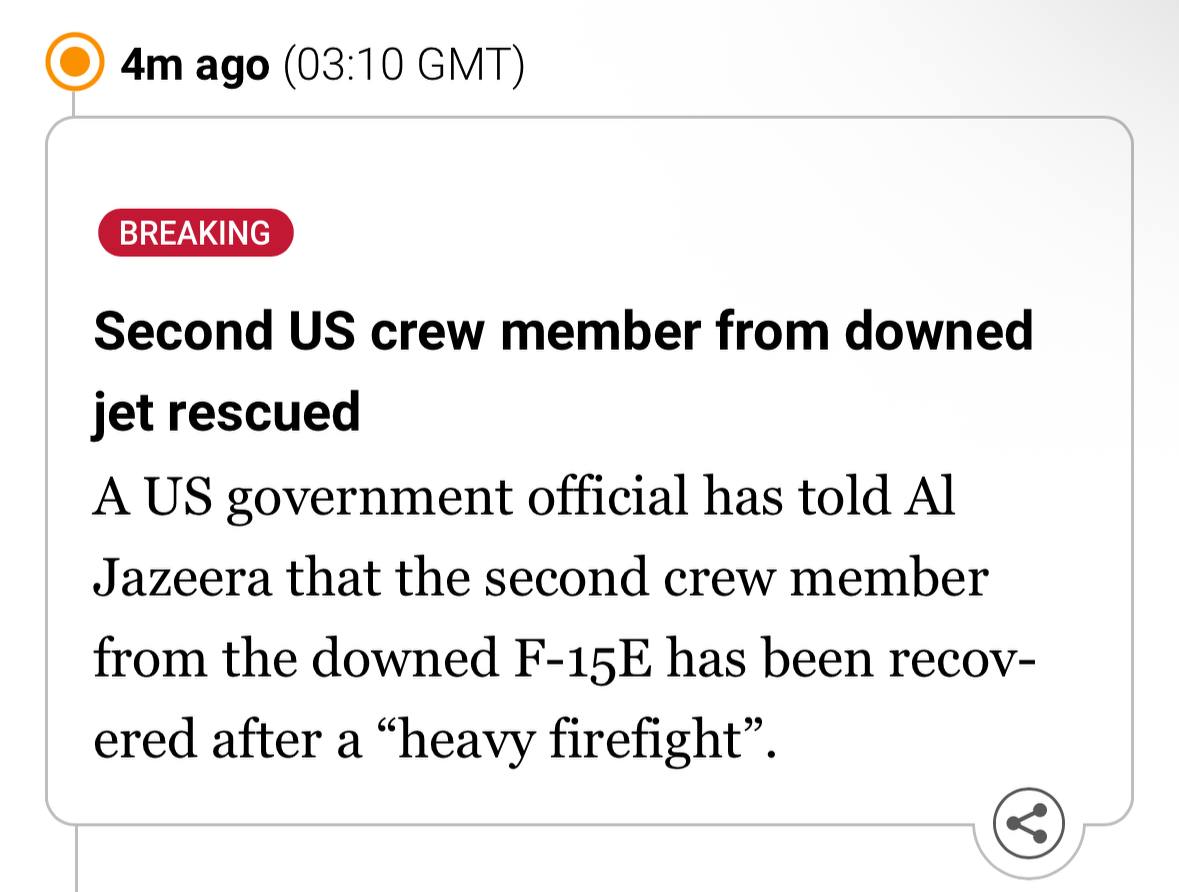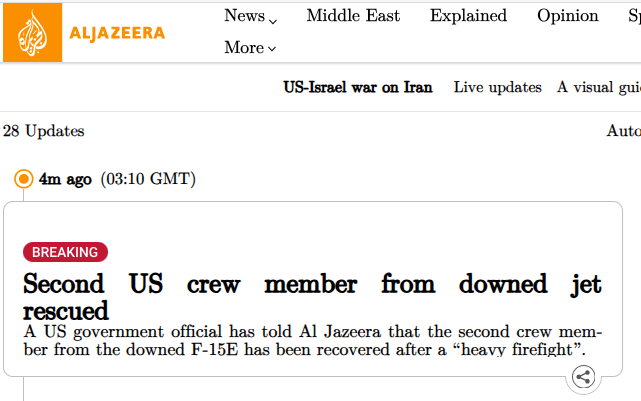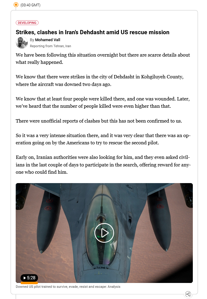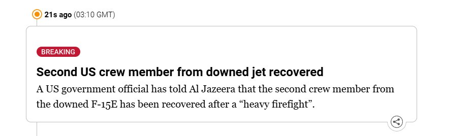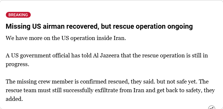>BREAKING NEWSMissing US airman recovered, but rescue operation ongoingWe have more on the US operation inside Iran.A US government official has told Al Jazeera that the rescue operation is still in progress.The missing crew member is confirmed rescued, they said. but not safe yet. The rescue team must still successfully exfiltrate from Iran and get back to safety, they added.