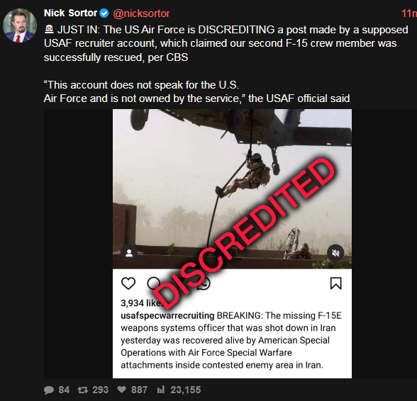 >>532414130>>532414206>US rescue team ‘still needs to exfiltrate’ airman from Iran>We were told by the US government source that overnight in Iran, a missing crew member of the downed F-15E has been located, and there was a rescue effort, but there was a fierce firefight.>The latest information we have with them is that the crew member has not left Iranian territory, and because of the ongoing hostilities, there could be still danger to that person and to other people involved in that rescue effort.>So, this is an ongoing, active, rescue effort, but that airman is not basically out of Iranian territory, and I want to be clear when I say airman in the US military parlance, that doesn’t necessarily mean a male.uhh... this doesn't look good. the first recovery was quicker, wasn't it?
