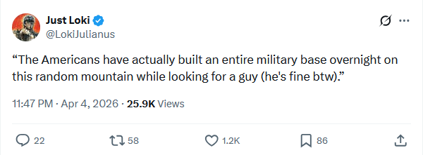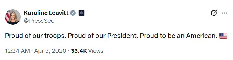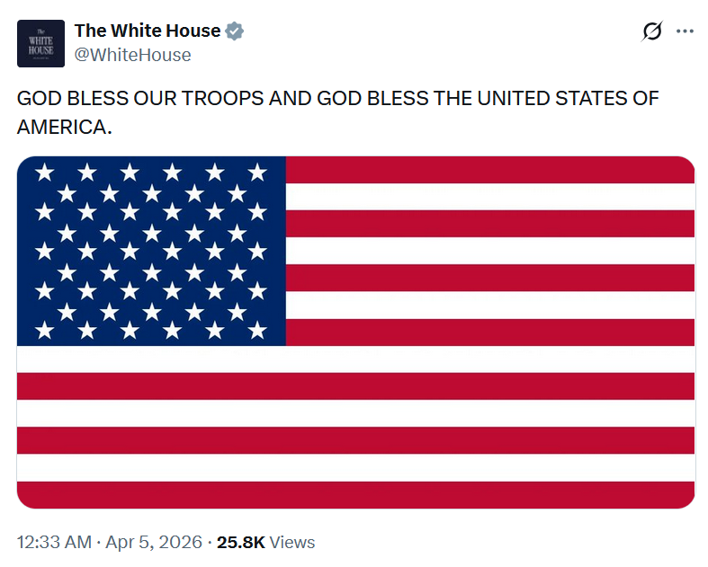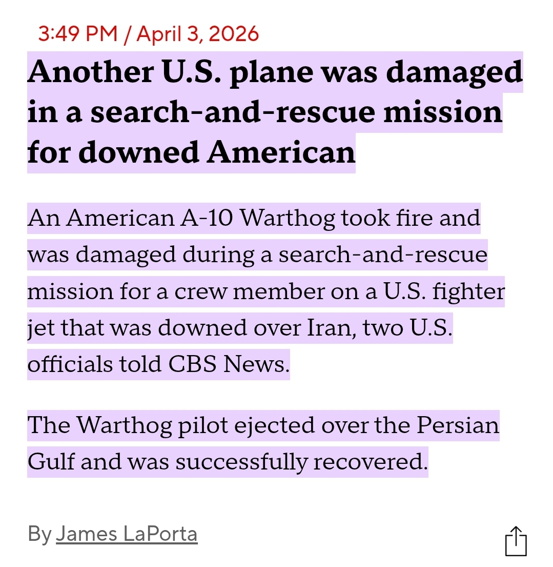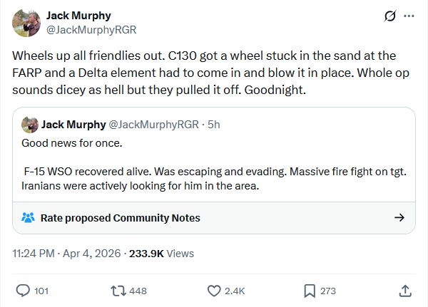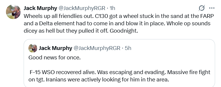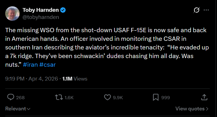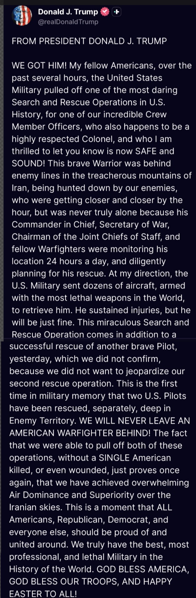 >“WE GOT HIM! My fellow Americans, over the past several hours, the United States Military pulled off one of the most daring Search and Rescue Operations in U.S. History, for one of our incredible Crew Office Members, who also happens to be a highly respected Colonel, and who I am thrilled to let you know is SAFE and SOUND!” - President Donald J. Trump https://x.com/WhiteHouse/status/2040644451513598220