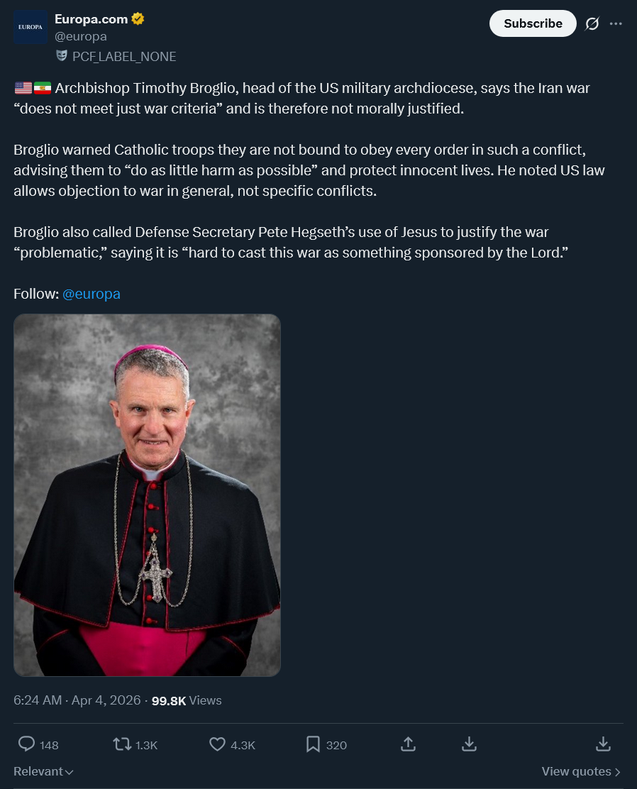 Archbiship says "[Iran War] does not meet just war criteria". He can wear cloth that identifies him as some holy man but in the end he is just a larping faggot.