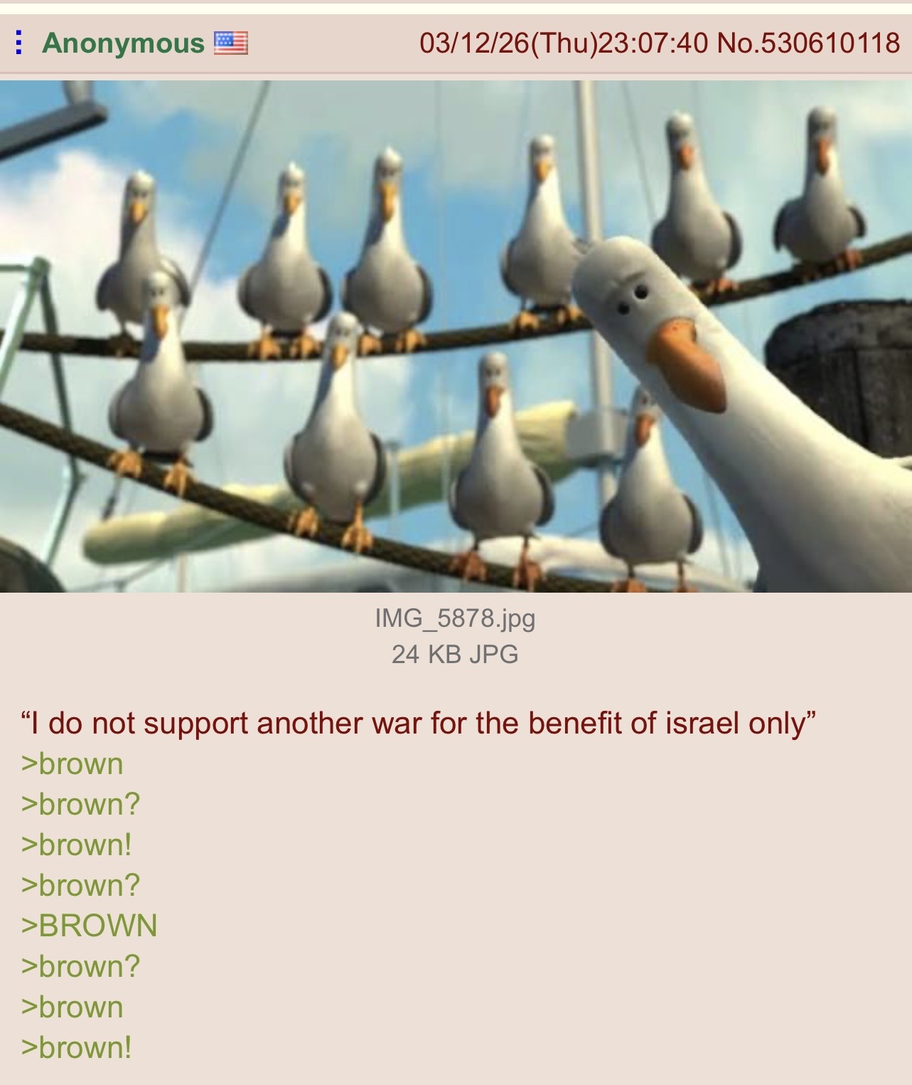 This makes senseAll the people screaming “brown” at anyone who thinks wars for Israel and jews who hate us aren’t such a good idea after allThere’s been a lot of that shit today