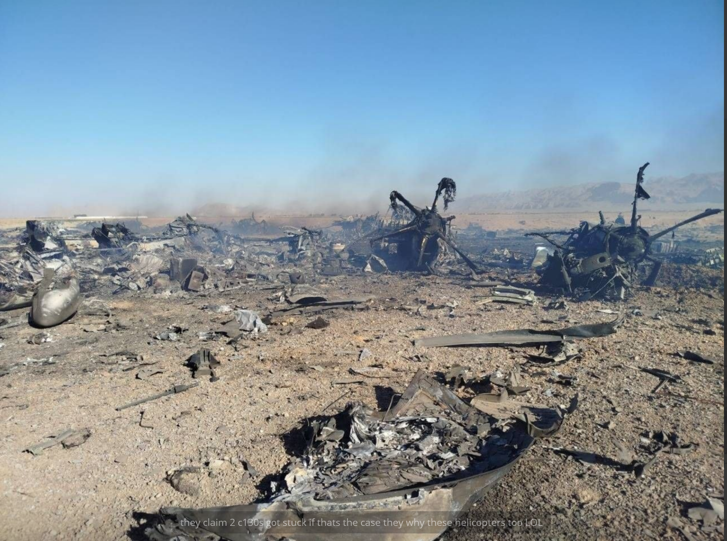 >>532435154>Lost 2 x MC-130s and 1 x MH-6 little bird helo>set up an airfield in the desertIt's a small win for America for getting their pilot out, otherwise a PoW would look pretty bad for propaganda, but those lost aircraft didn't get stuck in mud as the US claims. They certainly took heavy fire and damage rendering them inoperable. Also from my sources IRGC hadn't even arrived on site but only local farmer/militas with light arms were firing.