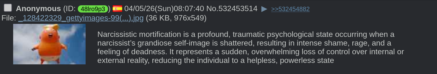 >>532457601Your detective skills are as faulty as your sanityEvery time one of you elite internet detectives guesses its wrong