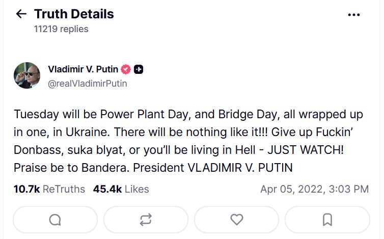 >>532447868>https://truthsocial.com/@realDonaldTrump/116351998782539414LMAO you legit can't tell whether any of his tweets are real or fake because they're so unhinged.