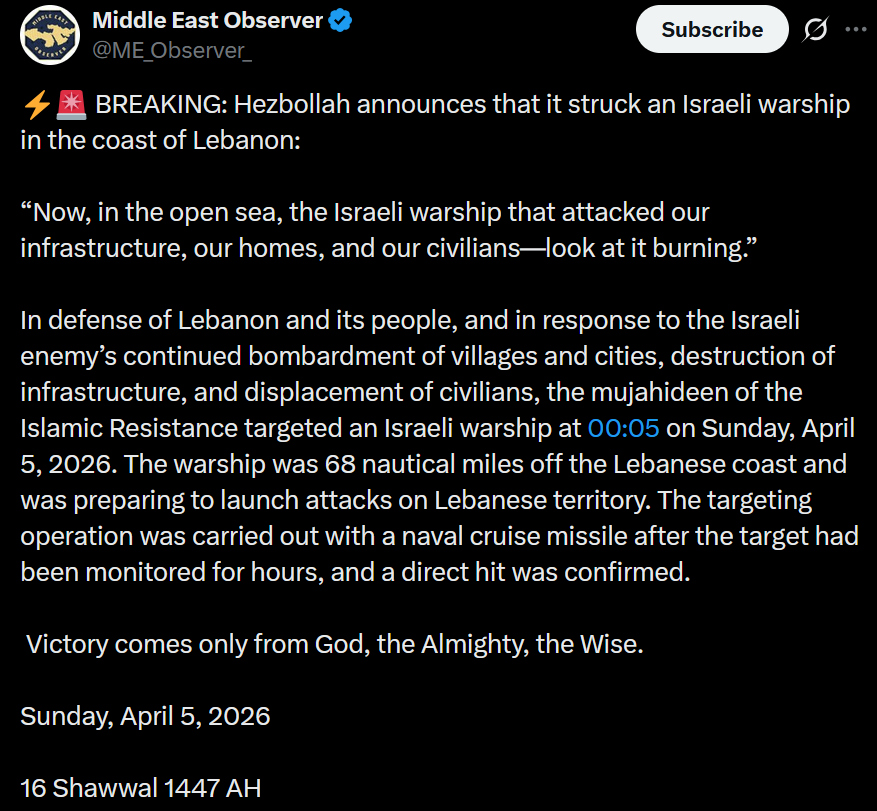 >HEZBOLLAH ANNOUNCES THEY STRUCK AN ISRAELI WARSHIP