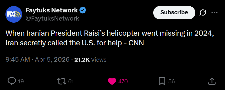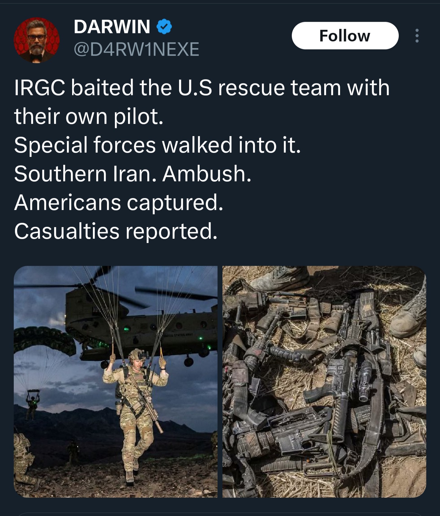 >Omg we saved the heckin pilot! He walked 300km on foot deeper into enemy territory next to a major iranian missile and nuclear site, while we circled the previous crash site with aircraft for no reason!Unclear what happened to the pilot, but those aircraft scuttled or near Isfahan were nothing to do with it and it takes like 5% critical thinking to determine so.Obviously it was an operation to strike at the infrastructure at Isfahan. But evidence had to be left behind and claiming it was part of rescue operations is the easiest cover up.