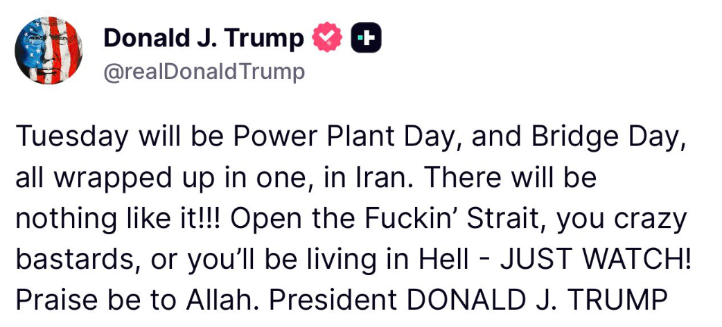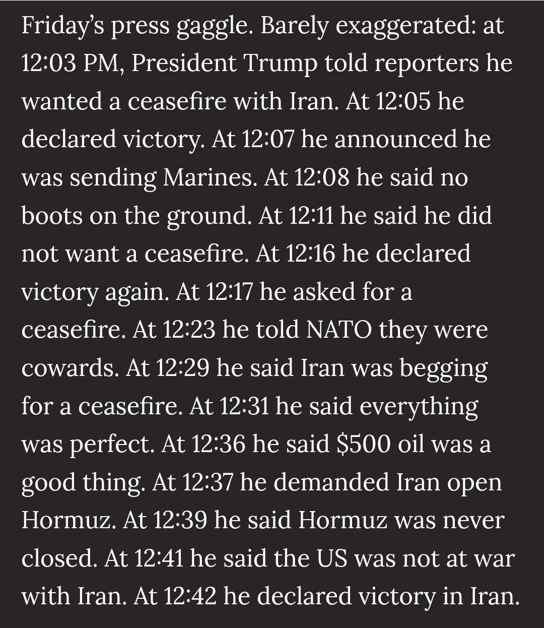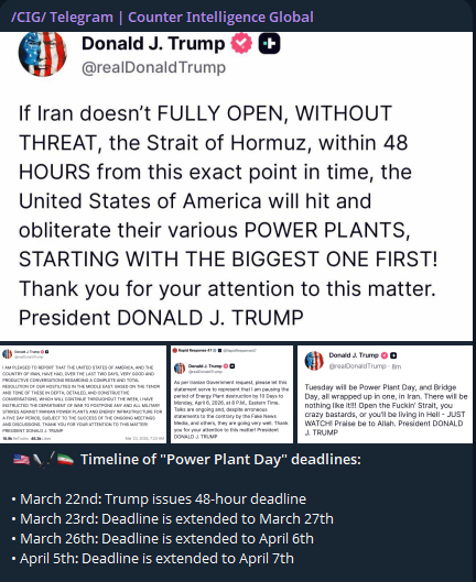 >>532451559Exactly. These mad tweets are for the benfit of maintaining a narrative with the American people. In private anything being conveyed to Iranians is likely COMPLETELY the opposite. Hence the strength of the necessary narrative at home. US: we are winning and crushing them! No mercyReality to Iran: Begging literally for a ceasefire and strait to open.If you won’t to understand what’s being conveyed to Iran (listening or not). Just invert the message and intensity of the tweets.