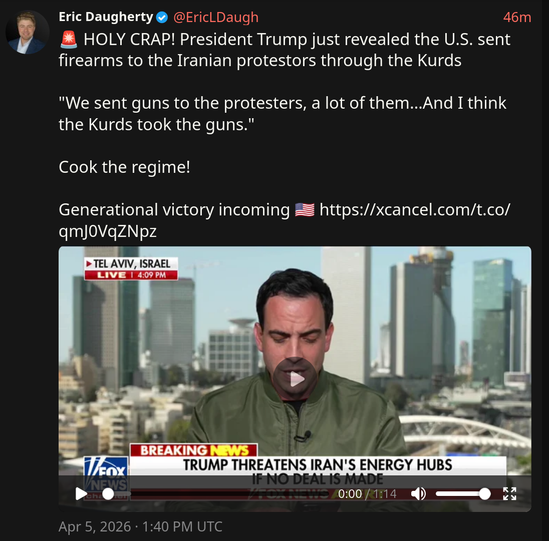 HOLY CRAP!https://x.com/EricLDaugh/status/2040786702646612145Trump just sent firearms to the Kurds!BOOOOOOMMMM!!!!!
