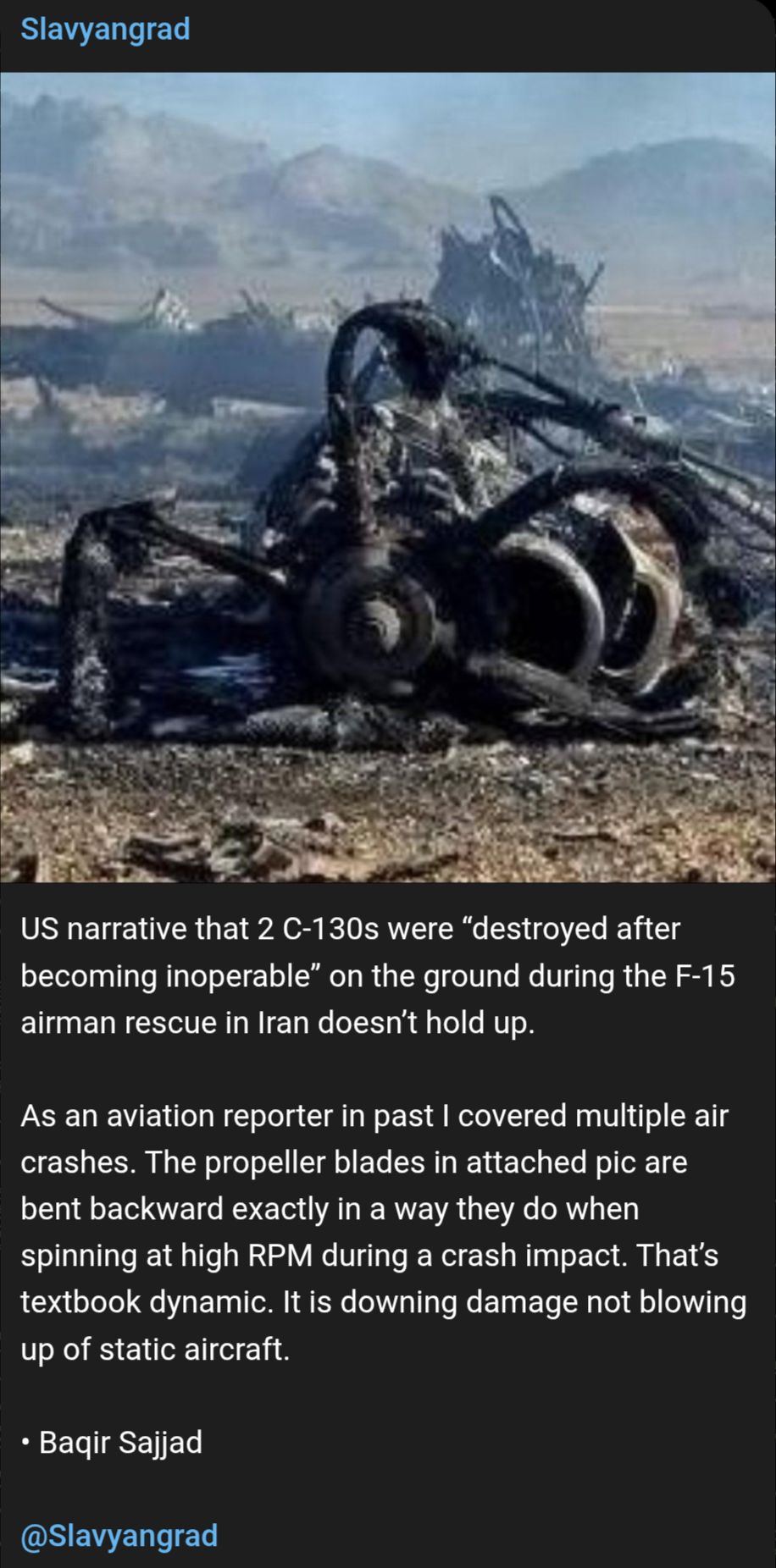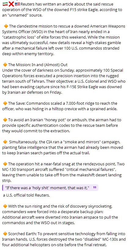 different opinion:>There’s a possibility that the large number of assets deployed and the use of that abandoned airfield served a purpose beyond a simple pilot rescue.>The details surrounding the F-15 crew recovery don’t fully add up. Why would such an operation require multiple C-130s, each capable of carrying 60–70 troops, just to extract one or two aircrew members, along with a small number of personnel from a downed rescue helicopter?>This scale of deployment suggests something more substantial. It’s possible that special forces were operating from a temporary forward base, with the C-130s supporting a broader mission rather than a straightforward rescue.>The biggest thing to note is that they operated out of coordinates (32.221360, 51.901322), making use of an old agricultural runway as a staging point. Notably, this location is only about 40 km from the Isfahan Nuclear Technology Center where (According to International Atomic Energy Agency Director General Rafael Grossi) nearly half of Iran’s enriched uranium stockpile is believed to be stored in an underground tunnel complex at this site.