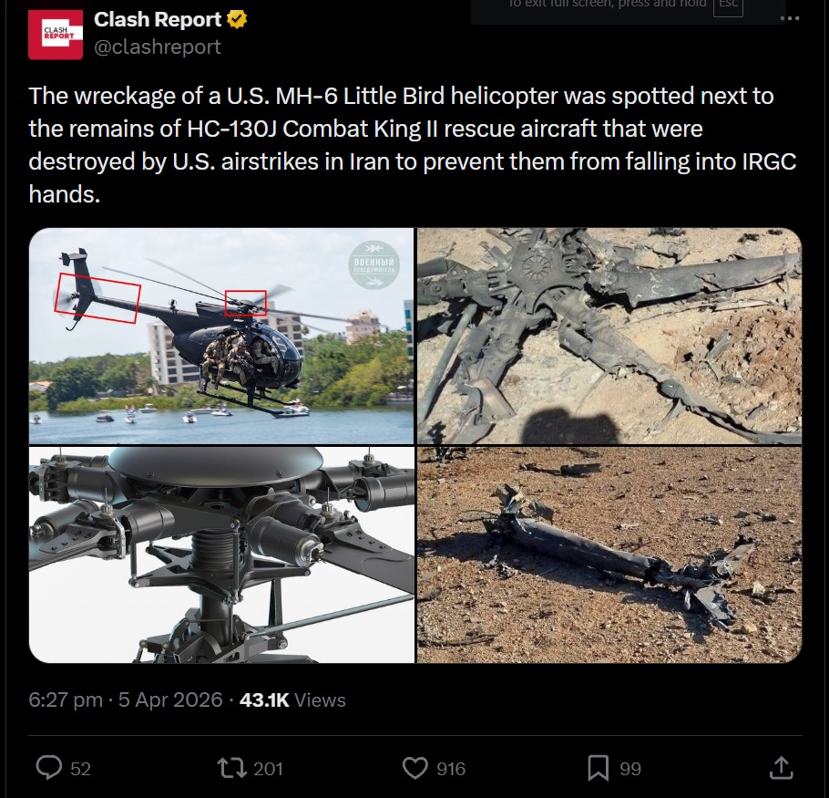 >Four MH-6 Little Bird helicopters used in the rescue mission in Iran were intentionally destroyed by U.S. forces, according to ABC News.>The helicopters had been used to ferry U.S. military personnel from the improvised landing strip south of Isfahan, where the MC-130J’s had landed, to the mountainous area where the F-15E crewmember was located.>Boeing is ending production of its MH-6 Little Bird light helicopter after fulfilling a current contract with Thailand, citing a lack of orders.RIP
