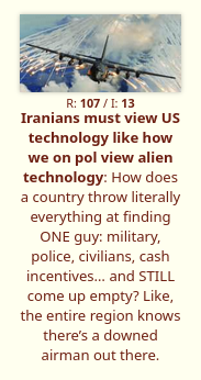 >>532488562>Iranians must view US technology like how we on /pol/ view alien technologyIndeed. Like how we view the Roswell incident. Overhyped trash crashing and burning in the middle of nowehere.