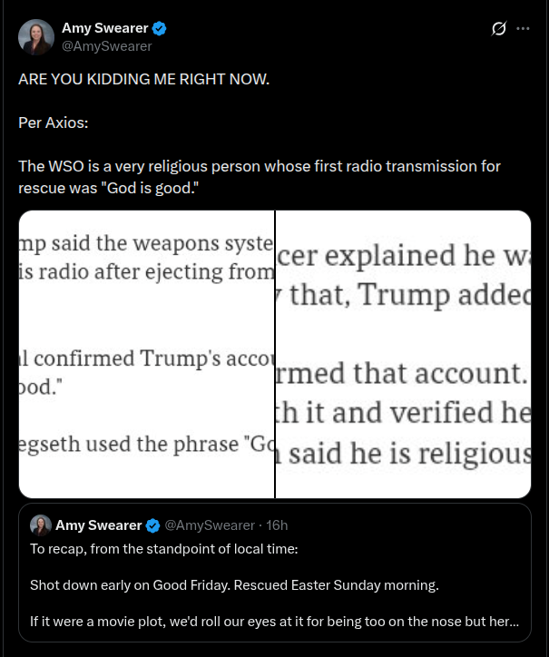>>53248554610 for being Easter+9 for Trump still being alive+11 for the pilot to be rescued safe+5 for the whole airstrip creation under the Iranian noses