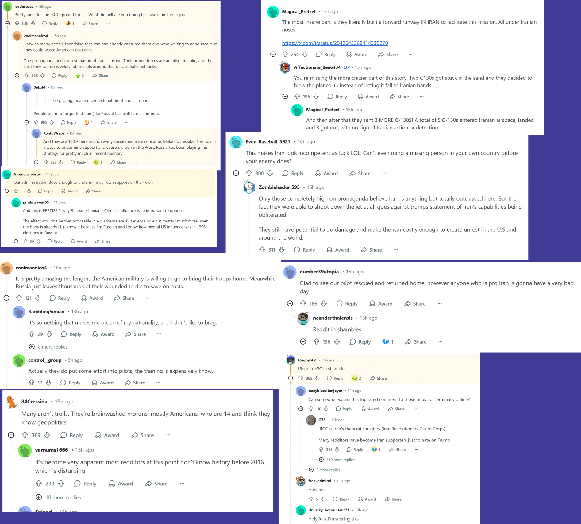 >>532483668Things have gotten so bad that even the retarded trannies on reddit that believe Ukraine is two weeks away from capturing Moscow and raping Putler to death on a livestream are noticing that the propaganda doesn't match reality.>Acknowledging that the USA goes to great lengths to save our own while the turd world treats their own like battle droids. Massive for optics, everyone know the "good guys" do this in the movies, that's especially impactful for zoomers raised on capeshit.>Acknowledging that they're being brigaded and botted by the irgc. We're now at a point where reddit has more self awareness than all of /pol/ outside of Petey Gee.>That comment in the top left from prnthrwaway55 is especially noteworthy. He's technically agreeing that orange man bad, but that people who want us dead use that very anger to undermine us. If he's not careful a few more years of nooooticing and he'll be posting here.>General acknowledgement of how incompetent the irgc was during this.r/worldnews/comments/1sctgp9/us_forces_rescue_second_crew_member_from_f15/