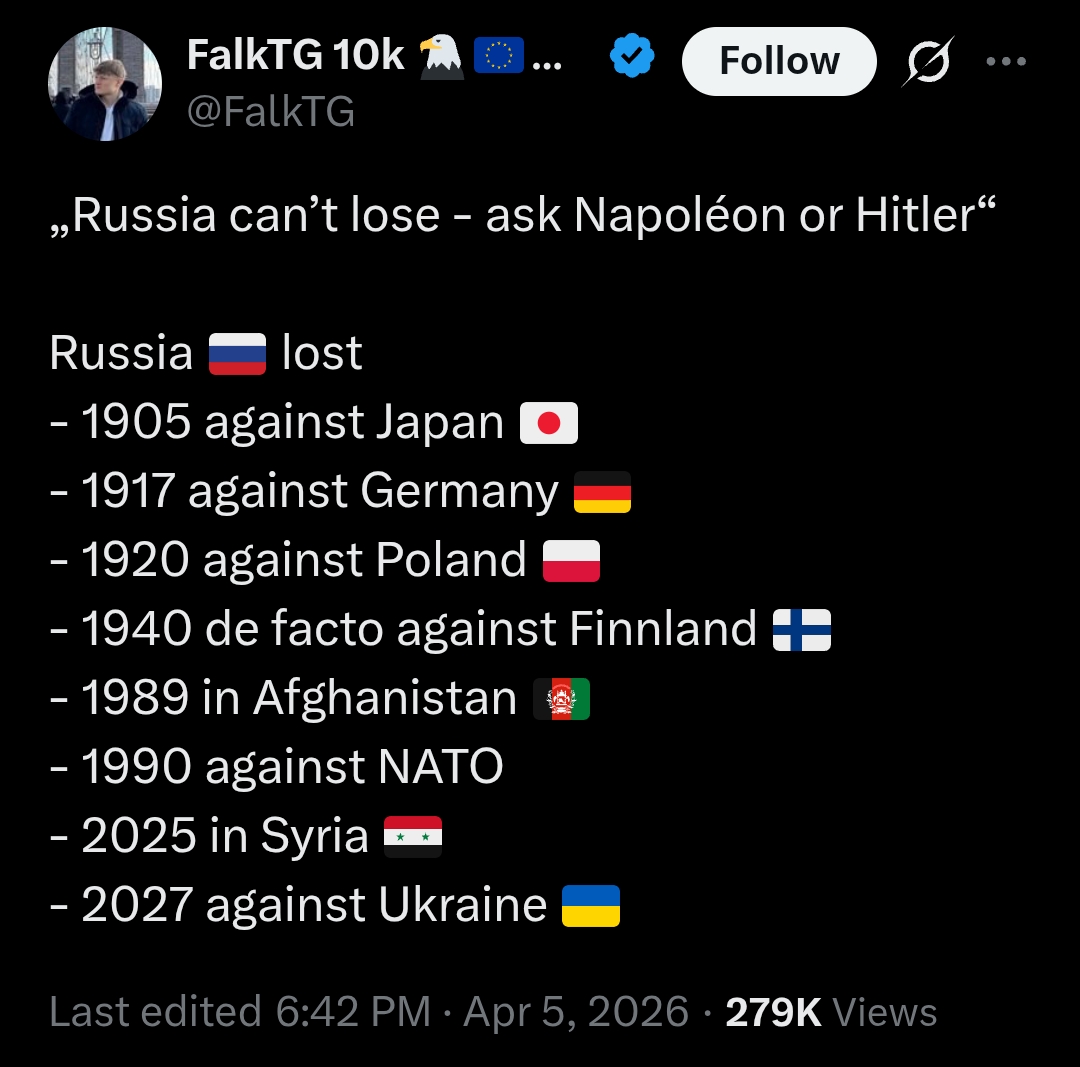 >>532496992>1905No one could field an army or an armada 20,000km away by then. Outlier example.>1917Won against Austria. Draw against Germany. Regime change caused a treaty that ended the war. Inflicted 5 million casualties.>1920200k vs 200k interwar skirmish. Inconclusive, per Polish historian Andrzej Chwalba, et al.>1940Finland literally lost territory and sued for peace.>1989The Russian-backed Afghan government retained control of the country, and the Afghan government kept power 3 years after the USSR collapsed. Russians bombed jihadists who were backed by the CIA and became Al Qaeda, then bombed 4 U.S. embassies and did 9/11.>1990 against NATOI didn’t know that Gorbachev causing inflation and monetary catastrophe was a NATO military operation. Strange...>2025 in SyriaRussia bombed ISIS and Al-Nusra into submission between 2015 and 2017. An impoverished Syria getting regime-changed by a Turkish proxy militia is not a war.>2027 against UkraineSo if you win 5 oblasts and advance on 3 others, you lose?>Zoomoid neocon pushing blatant propaganda slopEglin’s last hope.