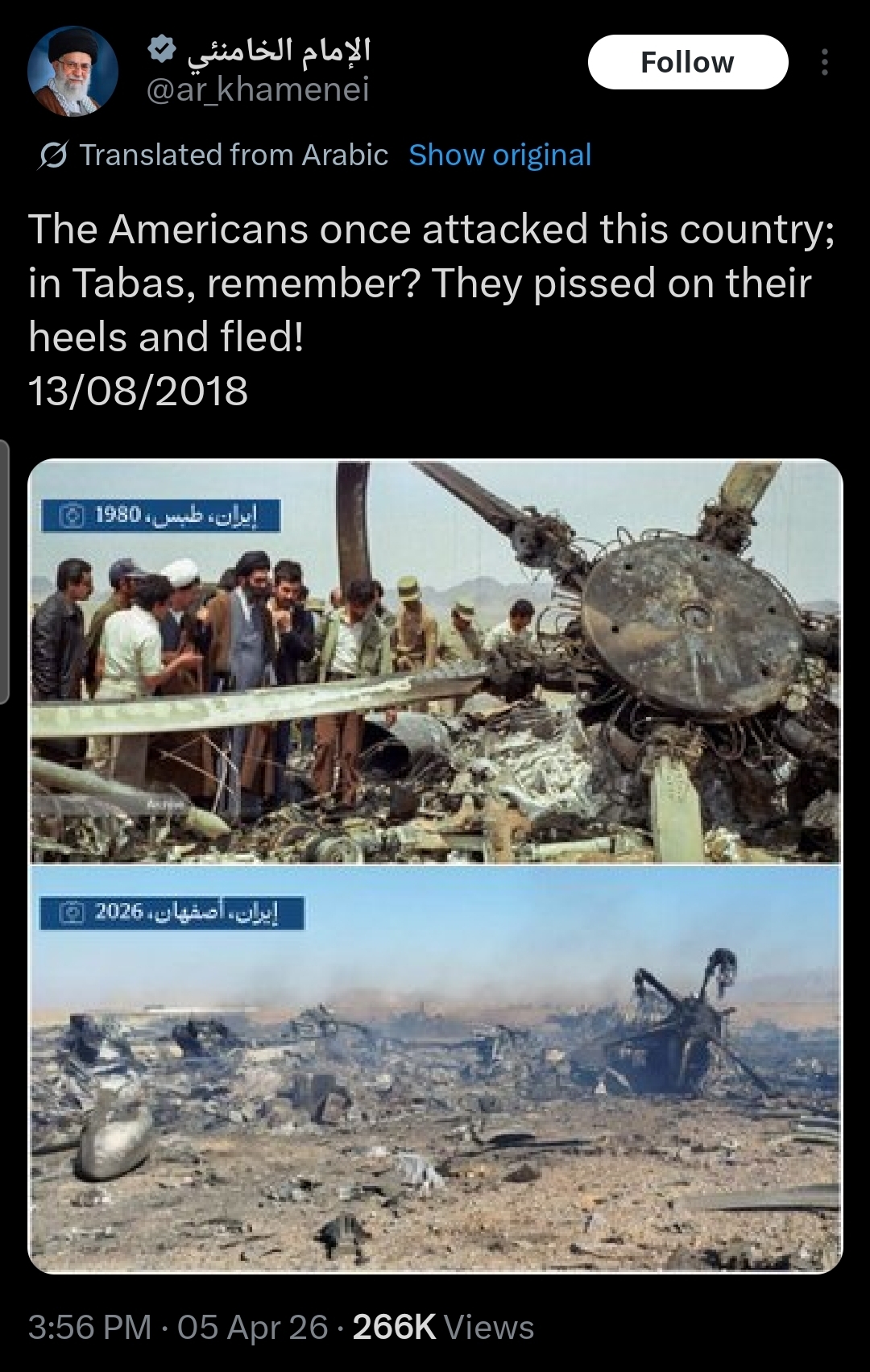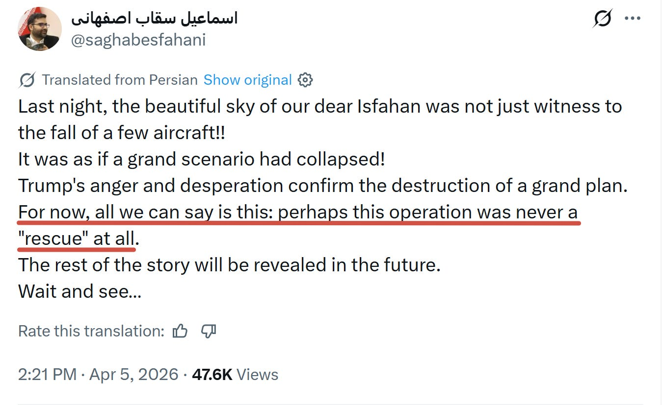 "rescue op" was the start of the "Go in and get their uranium op" that we've been waiting for. They got clocked immediately and their transport got shot to shit coming in. They had enough support and local force superiority that they managed to exfil many of them.Presumably the corpses left behind were crisped, so not much good as proof that things went poorly for the US Special Capeshift Forces.It's very possible Iran has a number of POW's (or the USG thinks they do), which goes some way to explaining why the US decided to arrest couple of random women whose surname includes Soleimani.