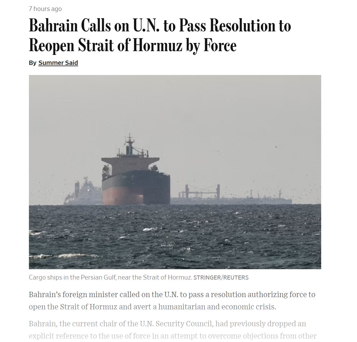 >“Bahrain has submitted another request to the U.N. to pass a resolution to reopen the Strait of Hormuz, which would authorize the use of force. Russia, China and France already blocked Bahrein’s request to the U.N. Security Council three days ago.” — The Wall Street Journal