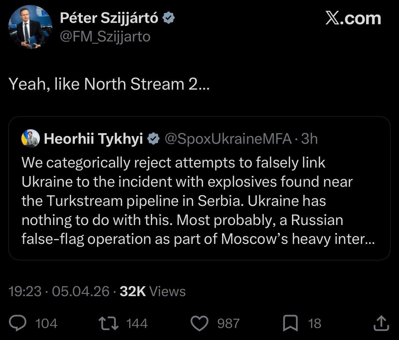 >Ukrainian Minister of Foreign Affairs, Heorhii Tykhyi: “We categorically reject attempts to falsely link Ukraine to the incident with explosives found near the Turkstream pipeline in Serbia. Ukraine has nothing to do with this. Most probably, a Russian false-flag operation as part of Moscow’s heavy interference in Hungarian elections.”