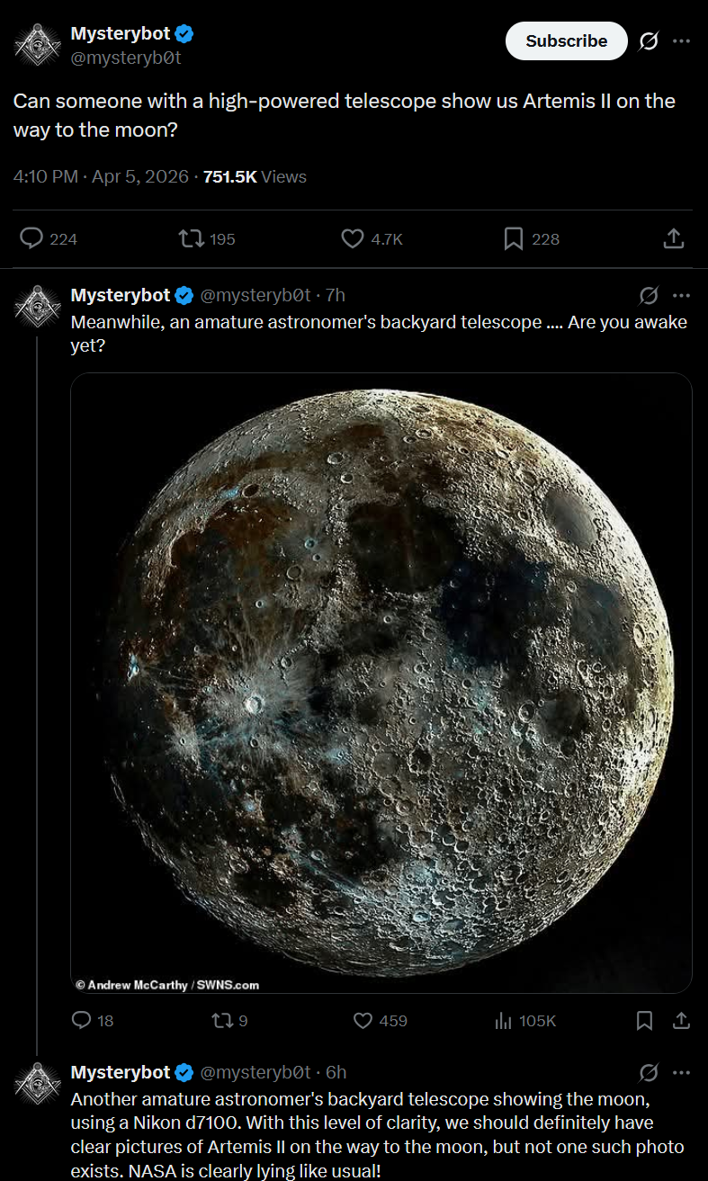 > === THE FINAL 24 HOURS === <The Orion spacecraft is now within 50,000 miles of the moon. There's less than a day before they arrive.>Artemis II MissionArtemis II NASA's first crewed mission to the Moon in over 50 years. Launched on April 1, 2026, the four-person crew is currently on a ~10-day lunar flyby mission aboard the Orion spacecraft. This is the first time humans have traveled beyond low Earth orbit since Apollo 17 in 1972. The flight is testing systems for future lunar landings.>Live Coveragehttps://www.youtube.com/watch?v=m3kR2KK8TEshttps://www.youtube.com/watch?v=6RwfNBtepa4>Mission Trackershttps://www.nasa.gov/missions/artemis-ii/arowhttps://artemis-ii-tracker.comhttps://issinfo.net/artemis.html>The CrewReid Wiseman (Commander) - Navy test pilot and former ISS astronaut.https://www.nasa.gov/people/reid-wisemanVictor Glover (Pilot) - Navy aviator, first black astronaut to live aboard the ISS, and Crew-1 pilot.https://www.nasa.gov/humans-in-space/astronauts/victor-j-gloverChristina Koch (Mission Specialist) - Record holder for longest single spaceflight by a woman (328 days).https://www.nasa.gov/people/christina-kochJeremy Hansen (Mission Specialist) - Canadian Space Agency astronaut, fighter pilot and physicist.https://www.asc-csa.gc.ca/eng/astronauts/canadian/active/bio-jeremy-hansen.asp>What is Orion?Orion is NASA's deep space exploration spacecraft designed to take humans to the Moon and beyond. This is its first crewed flight.https://www.nasa.gov/humans-in-space/orion-spacecraft/>Photoshttps://www.nasa.gov/gallery/artemis-ii-astronautshttps://www.nasa.gov/gallery/journey-to-the-moonhttps://www.nasa.gov/gallery/artemis-ii-launchhttps://www.nasa.gov/gallery/artemis>Additional Readinghttps://www.nasa.gov/mission/artemis-iihttps://en.wikipedia.org/wiki/Artemis_IIhttps://en.wikipedia.org/wiki/Orion_(spacecraft)Previous schizophrenia: >>532436471