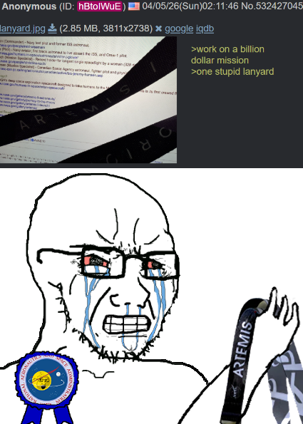>>532492671>launched on April 1st>launched on April 1st >launched on April 1st>launched on April 1stif you haven’t learned anything yet, they love numbers/dates/anything symbolic. Best day to launch another 75 year space stop? April fools! >ISSthe real story is them having to bring the ISS down not this fake moon bullshit