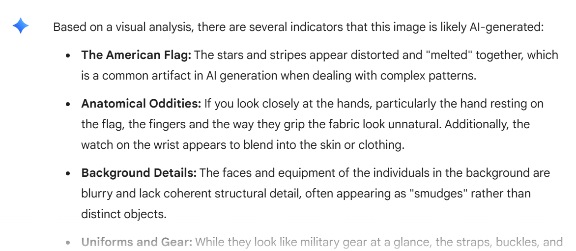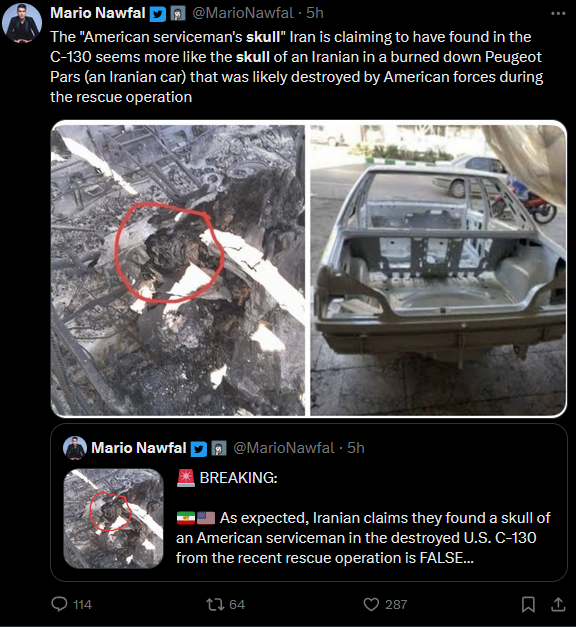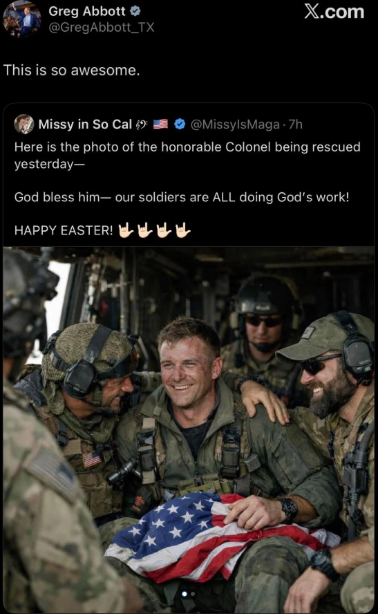 >>532495785Its ai generated, isn't it?The fact they are passing off this fake ai generated image of the "rescued" pilot means he must be dead. If they had an actual legit photo, they'd be showing that instead of this fabricated slop.