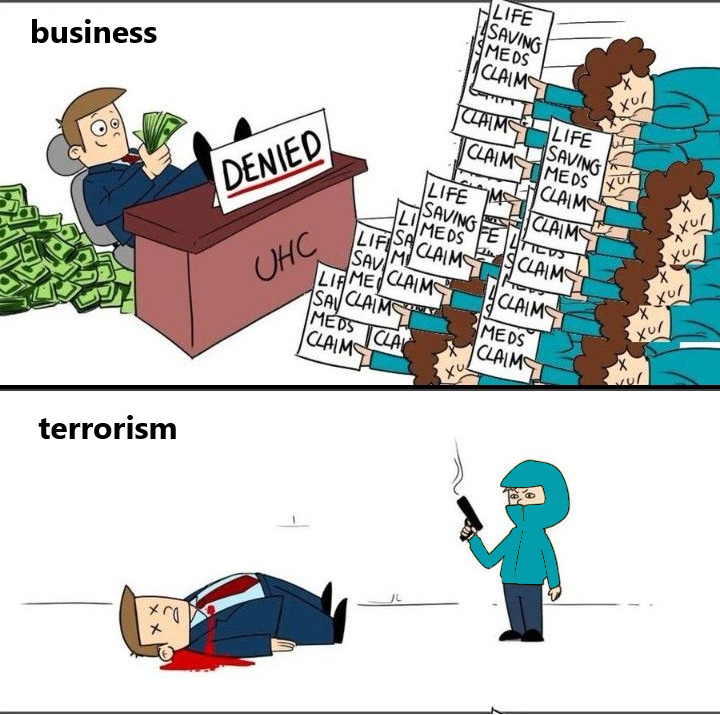 >>532501616There is no ethics here - it's just an advertisement for populism... If there were ethics here, there wouldn't be a single billionaire in the US, and people wouldn't kill each other with a stroke of a piece of paper... like insurance agents...PS I don't believe in Luigi's story - I consider it total PSY OPS, but still, if we take it in an idealistic version... it told a lot about society in the USA.