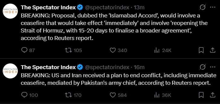 >The final agreement is expected to include Iranian commitments not to pursue nuclear weapons in exchange for sanctions relief and the release of frozen assets, the source said.>"Iran has not responded yet," one source said, adding proposals backed by Pakistan, China and the United States for a temporary ceasefire have drawn no commitment so far.Well, no response as of yet, but it does look surprisingly promising given that the concessions made by the United States is much greater than the initial proposal before the war.A decisive Iranian win if this deal goes through.