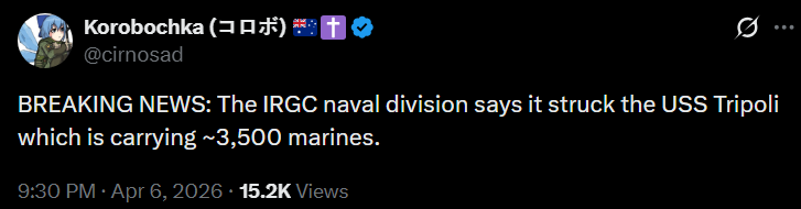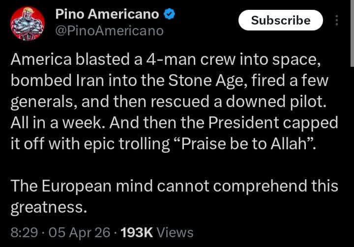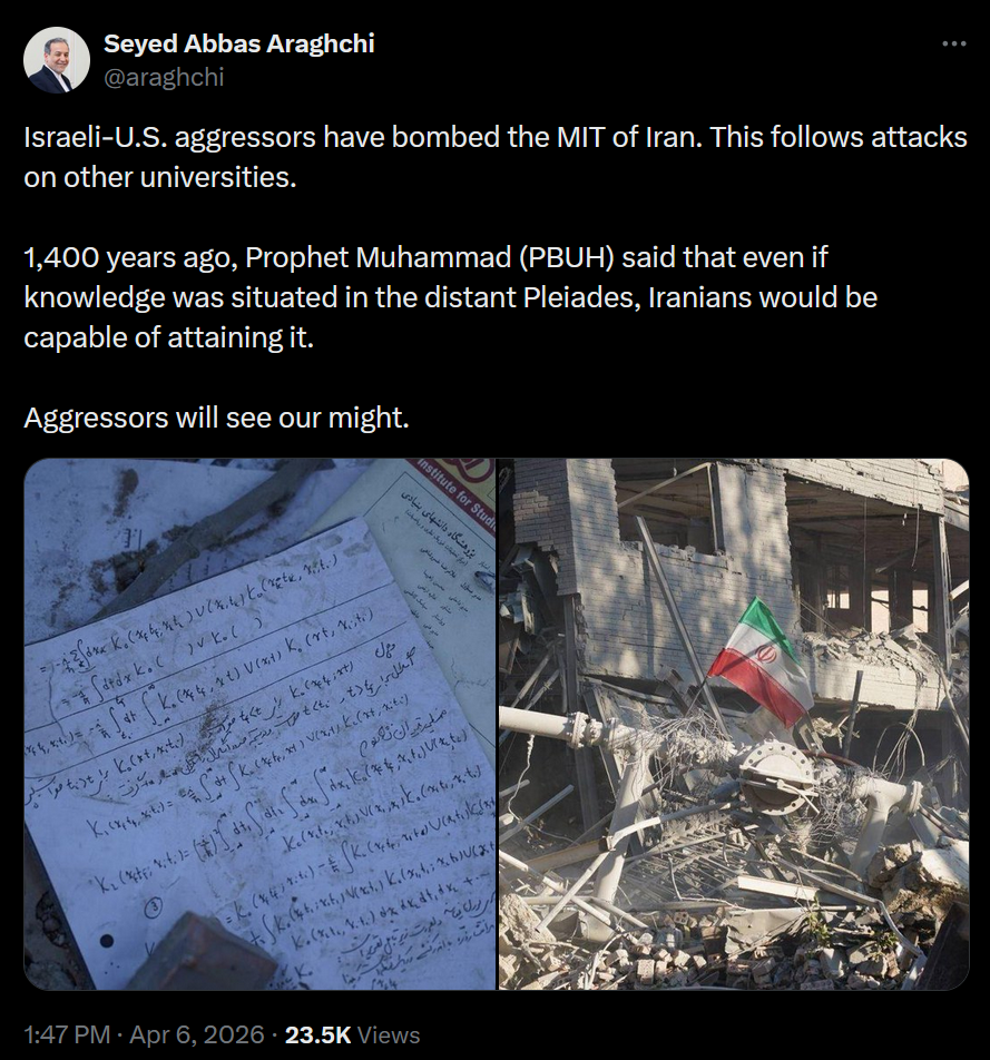 >Trump praises Allah (on Easter, of all days) and "delays" his ultimatum a 5th time, to 7 April, 8 pm EST. (Truth Social)