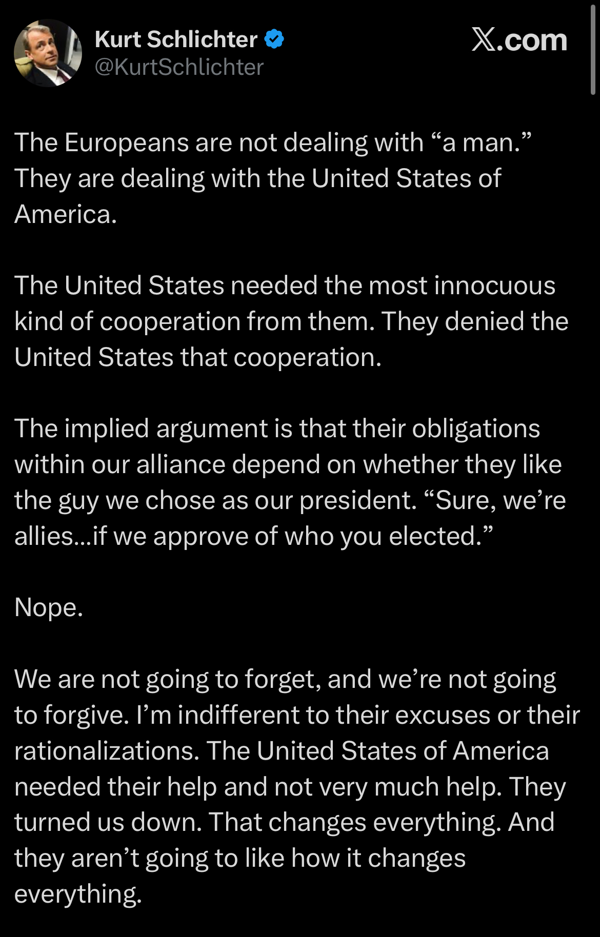 That’s a pretty big stretch. My wife is British (permanent US resident) and was a hardcore Trump supporter during the elections. She still doesn’t comprehend the enormity of the U.S. defense commitment to Europe post WW2; in terms of GDP. What she has noticed is how many hours per week that the typical American works versus the typical European. The piece that she’s still unable to connect is that the cozy lifestyle enjoyed by the Euros over the past 60 or years, for those is the West is a result of the U.S. essentially footing the bill for European defense. Yes, the U.S. wanted hegemony. Yes, the U.S. abused power in various regions at various times over this period. The point is the U.S., and western civilization as a whole, are in steep and rapid decline. Enjoy the crash or mourn what once was a great place to live; just accept the reality that us/ western hegemony is in the past. I just hope that we fare, historically, as well as the UK in our decline. Giving up any claim of control of the Hormuz Straights was one of the smarter things that POTUS has done in the Middle East imo.
