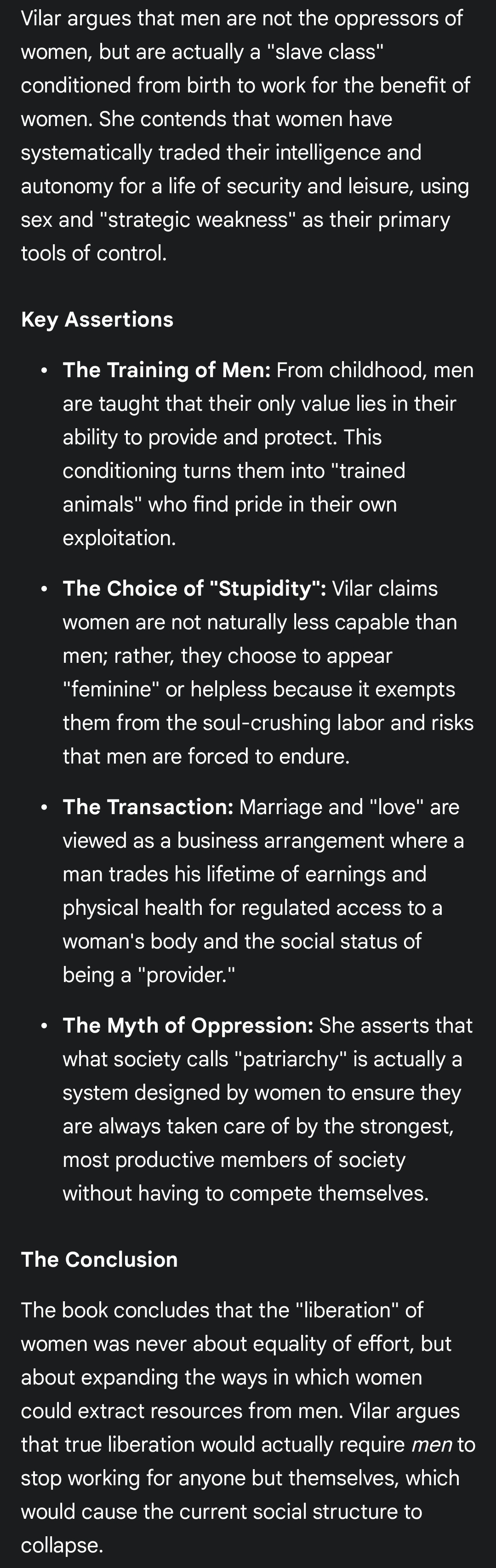 >>532522955Yea, it woke a lot of men up to the reality that women use access to sex as leverage for power in relationships.It explained why women put out for chad and make rules for you long before a manosphere existed. Of course, women hated Vilar for talking about it.