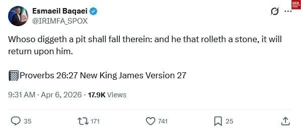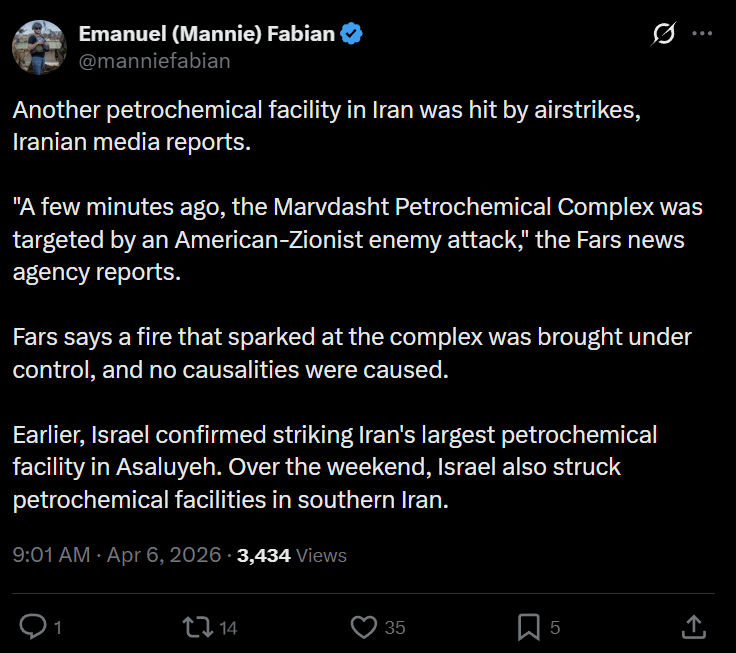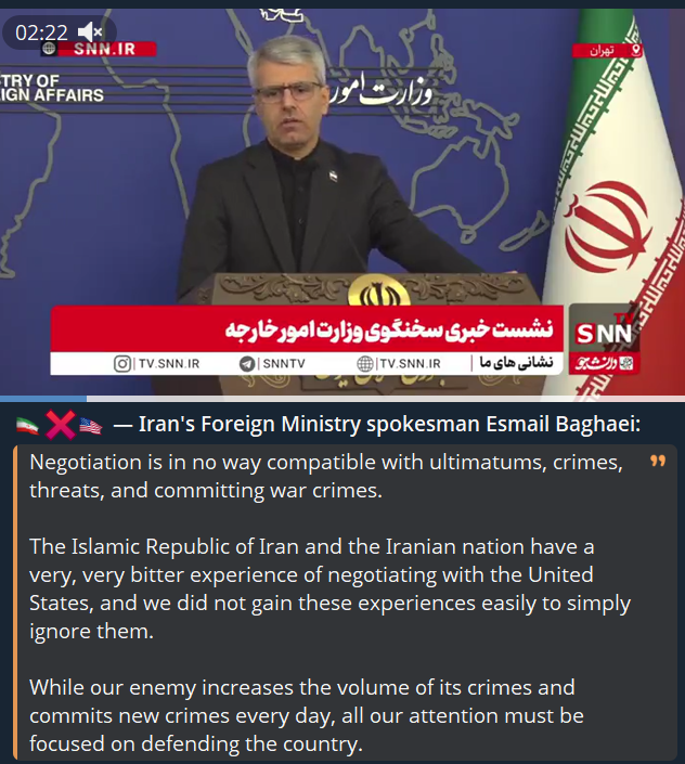 >Trump praises Allah (on Easter, of all days) and "delays" his ultimatum a 5th time, to 7 April, 8 pm EST. (Truth Social)