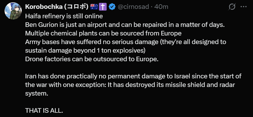 Wow cirnocel has been doomposting the piss and shit out of iran for the past 2 hours. Is he the new girkin? He's now saying iran has been bluffing this whole time and the us will send it back to the stone age