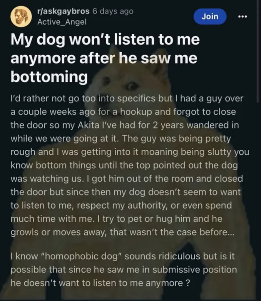 >>532529561>He actually got down on all fours and let a man mount him. No opinion he has is of any validity.Even their pets know this to be true
