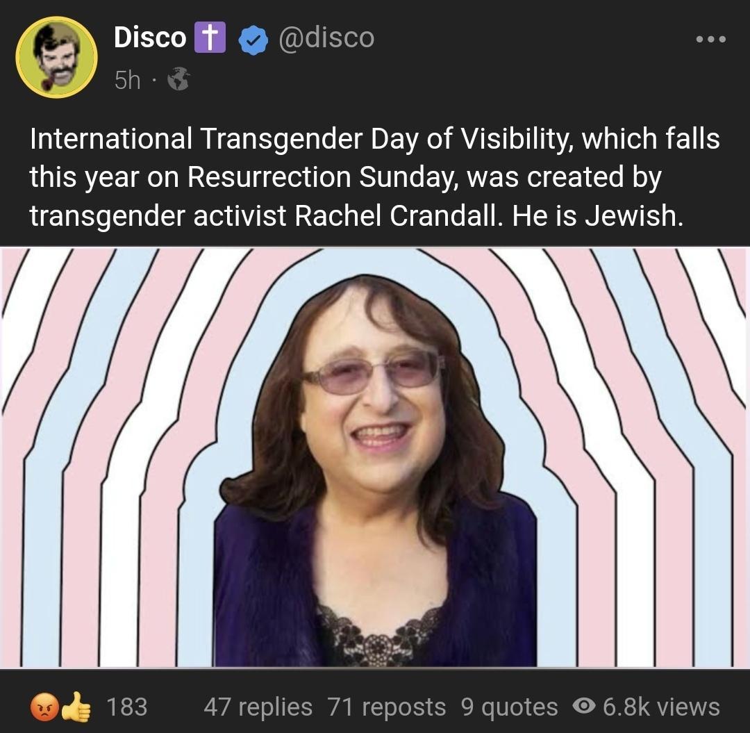 >>532530213This. It's exactly why globohomo and Jews love trannies (and the same reason they love Evangelicals), anyone whose whole identity revolves around denying observable reality can be convinced of any other absurdity with ease, and will readily attack anyone who tries to shatter their illusions and save them.
