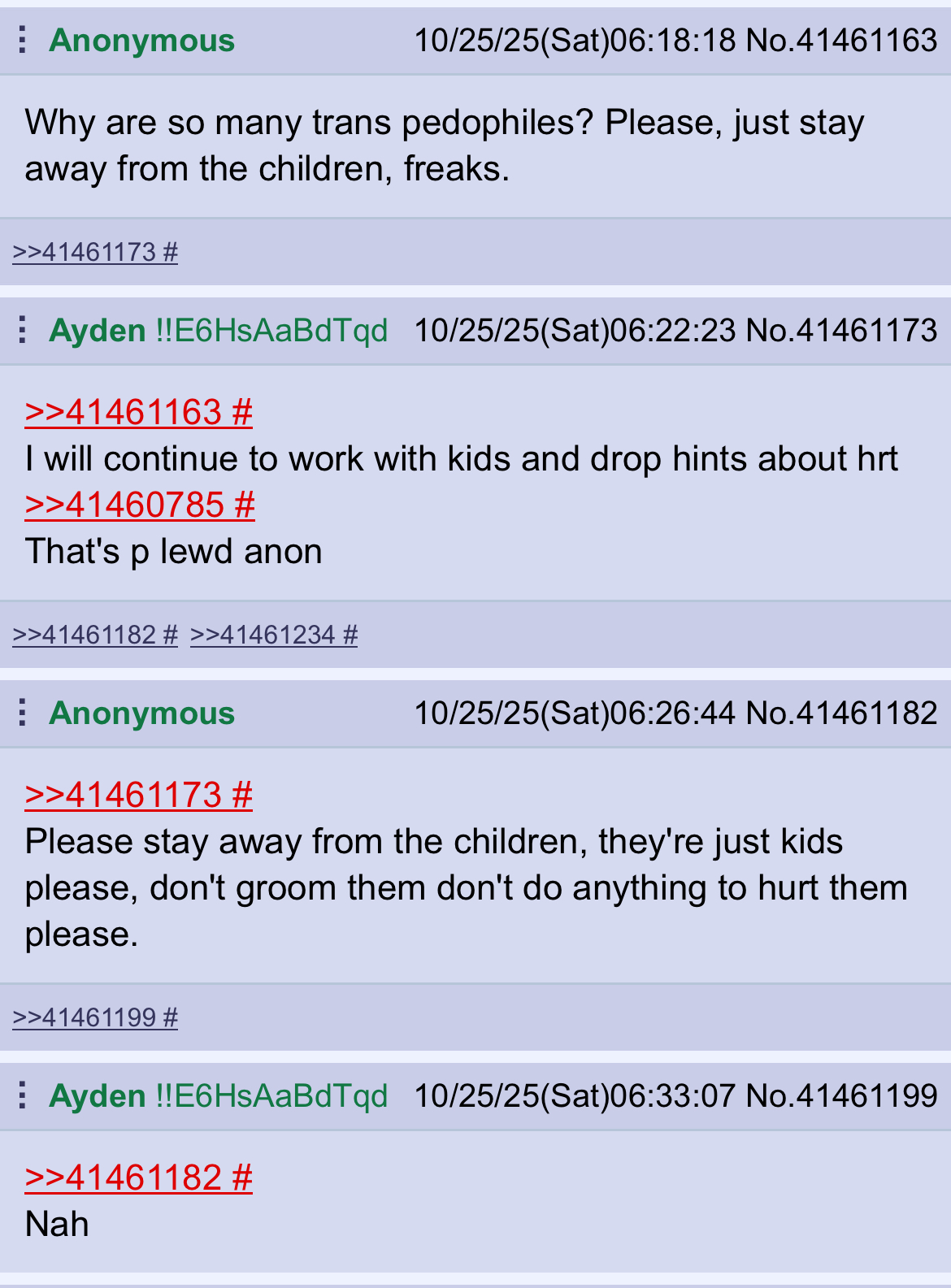 >>532531777>Trannies are a super popular fetishAmong gays and porn addicts who've never met one in person>top tier trannies are basically impossible to tell apart from womenIn heavily edited images and videos, sure. In person? Absolutely fucking not, any straight man who has spent any time around even a "passing" tranny would not willingly fuck one while sober.>her son would have long hair and listen to rock or paint his nails black because men aren't supposed to do thatNone of those things involve denying biological reality, and none involve censorship, child grooming or state propaganda