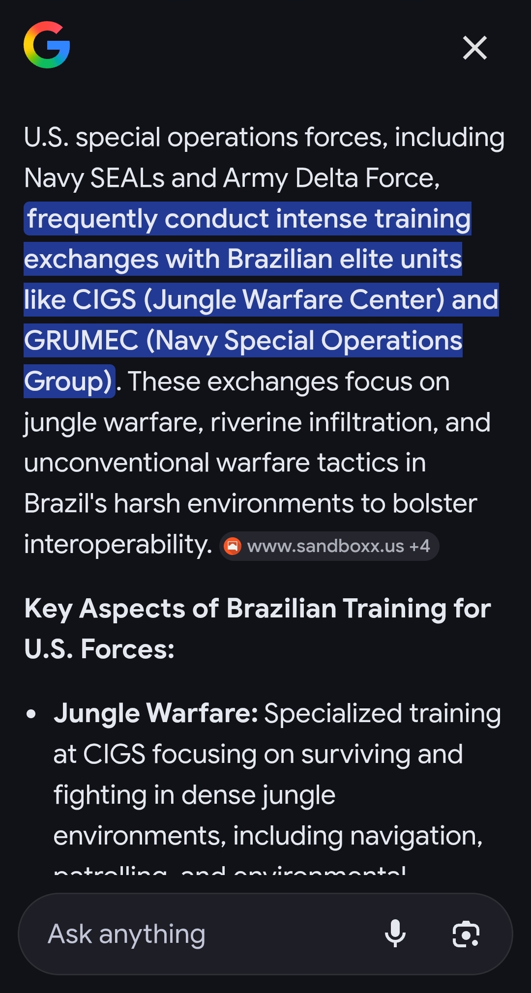 >>532550171>>532550192>In 2010, Lula was the president of Brazil, and Barack Obama was the president of the United States. At the time, both maintained excellent relations, which facilitated a troop exchange between the United States and Brazil. It was a hybrid team of special operators from Delta Force and the Navy SEALs, who on that occasion visited the Jungle Warfare Training Center in Manaus, Amazon. As a good host, at the time, the head of the CIGS instruction team, Colonel Fernando Montenegro, offered the visitors the opportunity to participate in the jungle operations course.>But the request was rejected by the United States military attaché in Brazil, who refused, saying that those troops already had extensive experience in operations in various parts of the world and did not want to take the course. They only wanted the CIGS (Jungle Warfare Training Center) to provide training in the Amazon rainforest, in the form of a military exercise, at a level more difficult than the CIGS could offer.this is old news from 2010, it's actually not from 2025, so the headline was misleading. still, it appears they indeed left one week later of jungle survival training, since eating larvae and insects was too much for them.