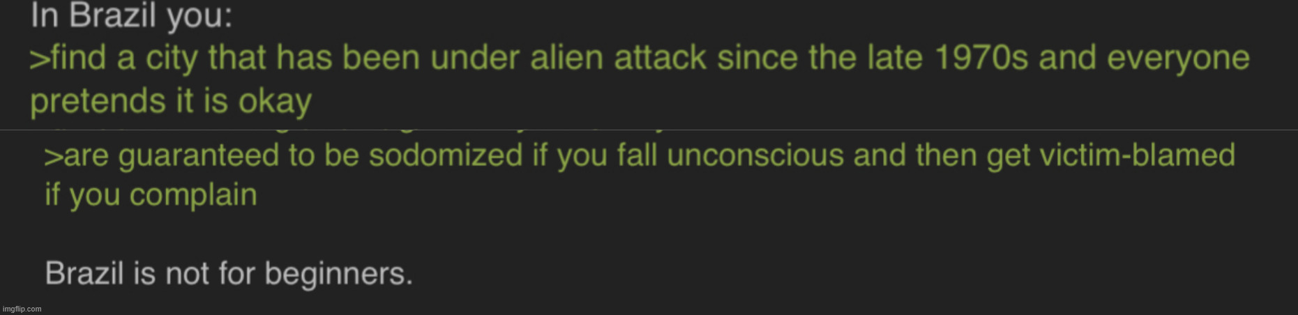 All you need to know about Brazil is there is a giant neon party truck you drink in while next level advanced niggotry happens outside called Hurricane Carthttps://youtu.be/gV9Gjyl5kOs