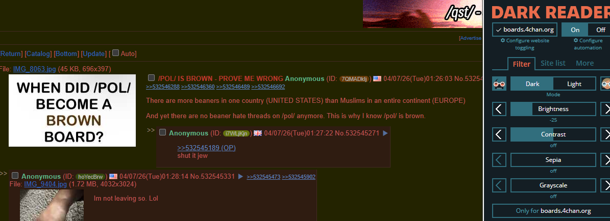 >>532545189This place is overran by libtards and non-whites. Many of the people here now came from Reddit bc they were upset that moderators weren’t getting paid (fucking kek).
