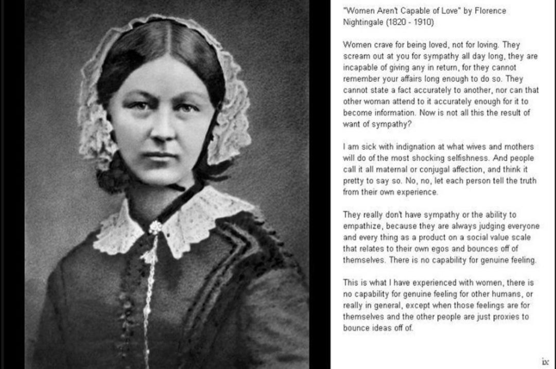 >>532550605Florence Nightingale>after seeing many Victorian wives of veterans abandon their often maimed husbands for other men.It was a hyperbolic and admittedly emotional response to how see saw these Victorian women, because as someone who worked tirelessly with these soldiers, how could she not be moved to tears and borderline rage at such callousness