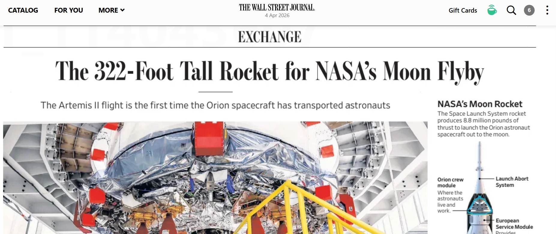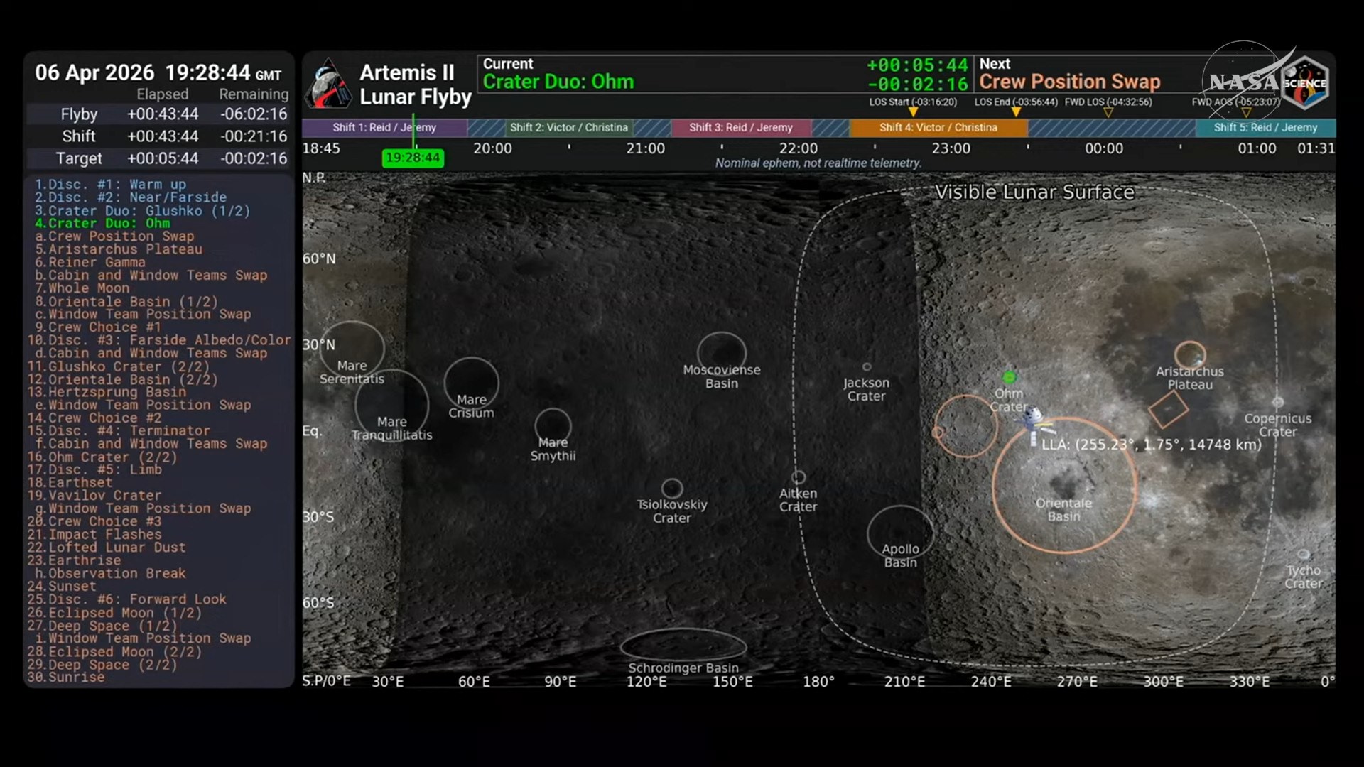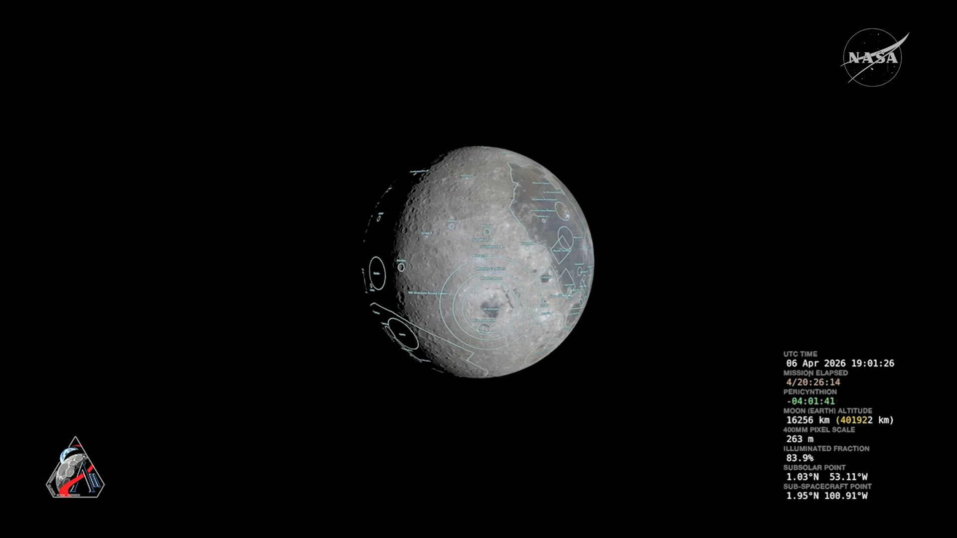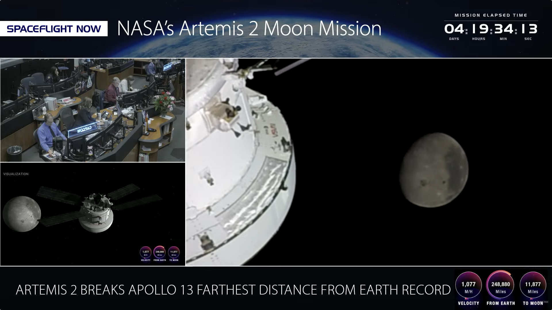 > === THE FINAL FEW HOURS === <The Orion spacecraft is now within 12,000 miles of the moon. 5 hours until the closest approach.>Artemis II MissionArtemis II NASA's first crewed mission to the Moon in over 50 years. Launched on April 1, 2026, the four-person crew is currently on a ~10-day lunar flyby mission aboard the Orion spacecraft. This is the first time humans have traveled beyond low Earth orbit since Apollo 17 in 1972. The flight is testing systems for future lunar landings.>Live Coveragehttps://www.youtube.com/watch?v=m3kR2KK8TEshttps://www.youtube.com/watch?v=z-j1uxBmis0>Mission Trackershttps://www.nasa.gov/missions/artemis-ii/arowhttps://artemis-ii-tracker.comhttps://issinfo.net/artemis.html>The CrewReid Wiseman (Commander) - Navy test pilot and former ISS astronaut.https://www.nasa.gov/people/reid-wisemanVictor Glover (Pilot) - Navy aviator, first black astronaut to live aboard the ISS, and Crew-1 pilot.https://www.nasa.gov/humans-in-space/astronauts/victor-j-gloverChristina Koch (Mission Specialist) - Record holder for longest single spaceflight by a woman (328 days).https://www.nasa.gov/people/christina-kochJeremy Hansen (Mission Specialist) - Canadian Space Agency astronaut, fighter pilot and physicist.https://www.asc-csa.gc.ca/eng/astronauts/canadian/active/bio-jeremy-hansen.asp>What is Orion?Orion is NASA's deep space exploration spacecraft designed to take humans to the Moon and beyond. This is its first crewed flight.https://www.nasa.gov/humans-in-space/orion-spacecraft/>Photoshttps://www.nasa.gov/gallery/artemis-ii-astronautshttps://www.nasa.gov/gallery/journey-to-the-moonhttps://www.nasa.gov/gallery/artemis-ii-launchhttps://www.nasa.gov/gallery/artemis>Additional Readinghttps://www.nasa.gov/mission/artemis-iihttps://en.wikipedia.org/wiki/Artemis_IIhttps://en.wikipedia.org/wiki/Orion_(spacecraft)Previous thread: >>532492671