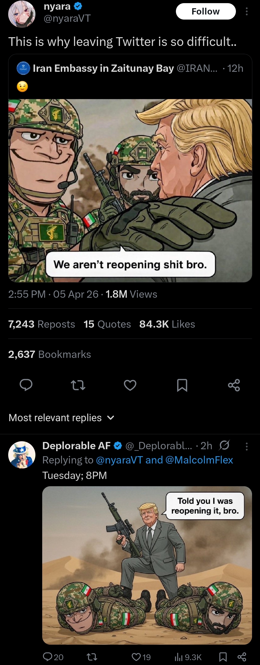 I look forward to the strait being closed on Wednesday and the migger cope that follows.