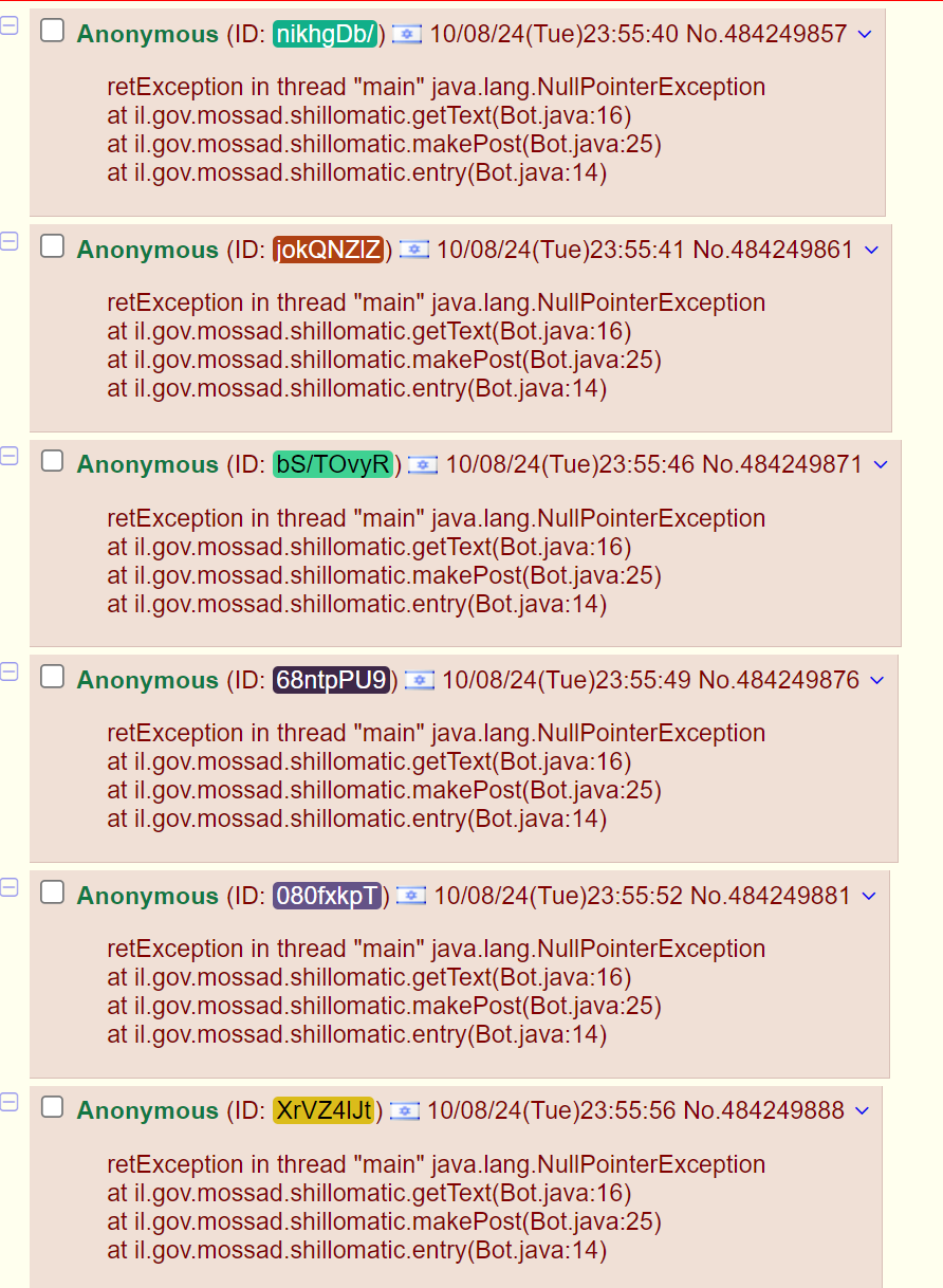 >>532571131> retException in thread "main" java.lang.NullPointerExceptionat il.gov.mossad.shillomatic.getText(Bot.java:16)at il.gov.mossad.shillomatic.makePost(Bot.java:25)at il.gov.mossad.shillomatic.entry(Bot.java:14)