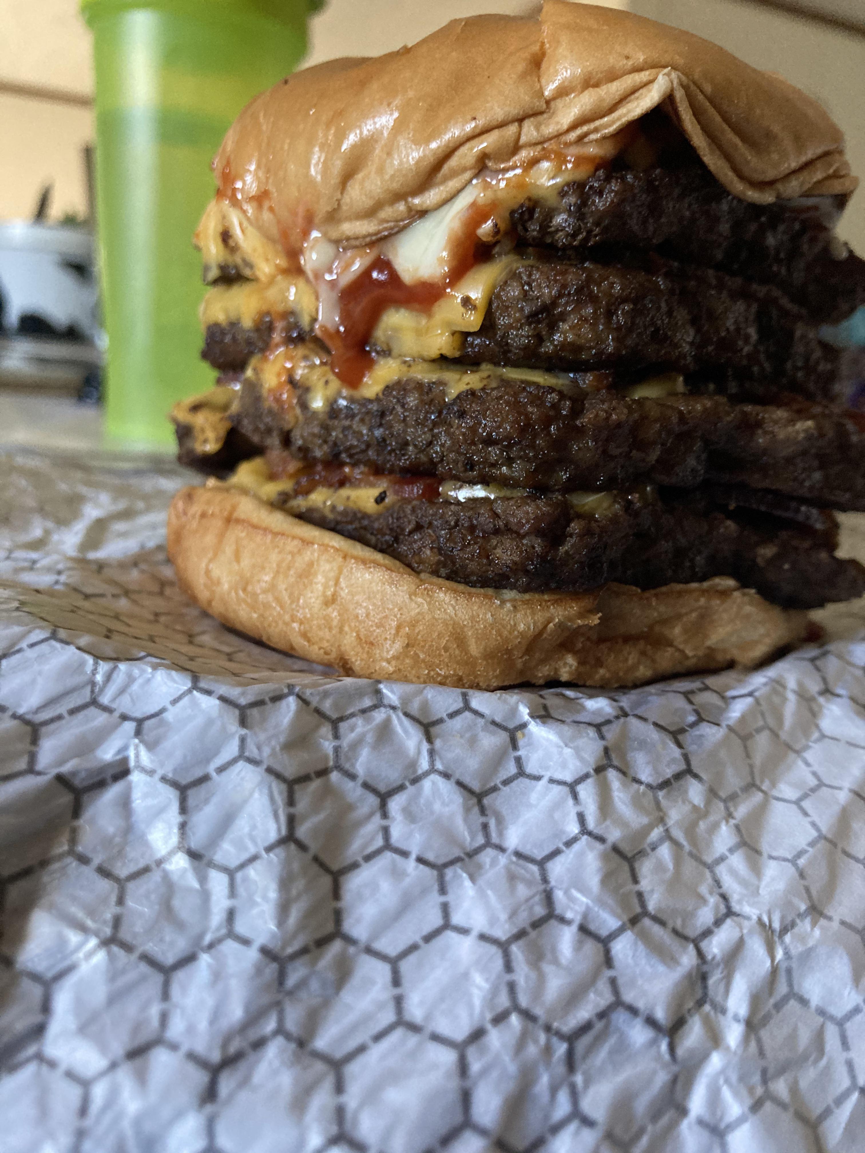 >>532580229Quadruple Bacon cheese burgerIn between each patty is 6 pieces of bacon and cheese