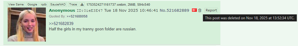 >532592499>my friend shot a deer and gave me some of the meat a month ago but it had maggotsThat's a shame, also unusual so I imagine your buddy shot an already wounded deer. One of the ones I shot had CWD but it's not actually transmissible to humans yet and so I kept it. After all, you feel like a king with a freezer full of venison.Also, considering you're one of the few shills on here who hasn't managed to dox themselves, it hints that you're very deliberately careful to not reveal yourself. You know what will happen if one of us ever found out who you actually are and where you live. That's why goreleaf doesn't show up here anymore.