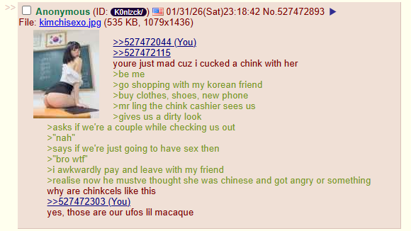 >>532593356>another shill hopped on methmeth and izzata dangerous drug>>532592244wanna make his roleplay even more embarrassing?>So your Korean friendhe larps claiming that he banged his gook "friend"he has whole fanfic between him and this gookincluding supposed screenshots of him begging her to cook some food (like a homeless bum asking for some coins)